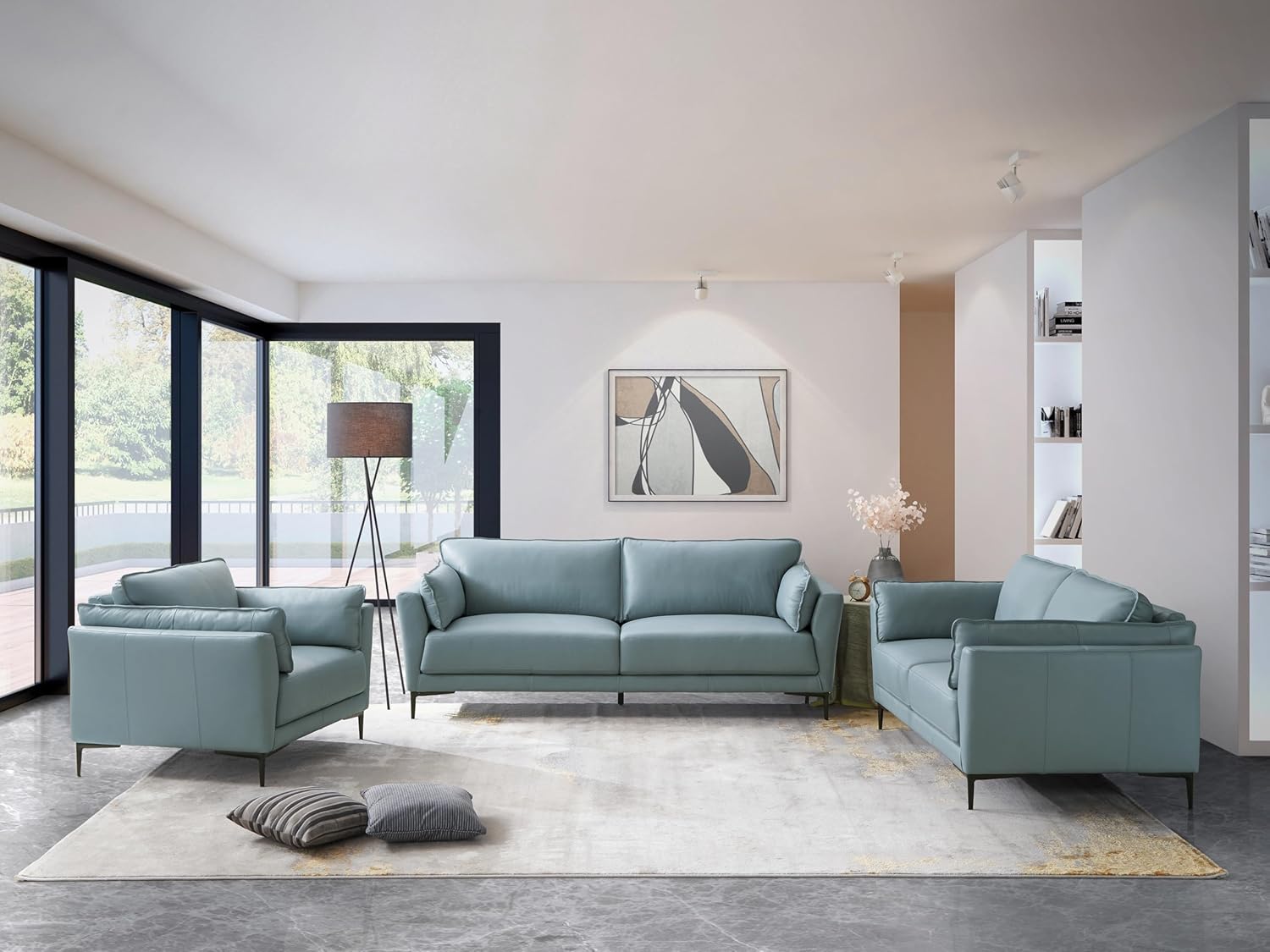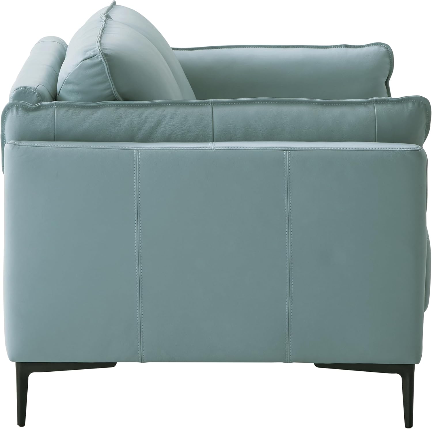 Add to an existing ensemble or carve out a seating venue in a compact loft or apartment with a loveseat designed for comfort and aesthetics. This contemporary loveseat features a two-seater design with tight foam-filled seats and loose back cushions. A soft light blue finish in top grain leather offers a blush of color and soft-to-the-touch comfort. Plywood and MDF construction adds a sturdy feel to this chic loveseat with slender black metal legs creating an interesting contrast.