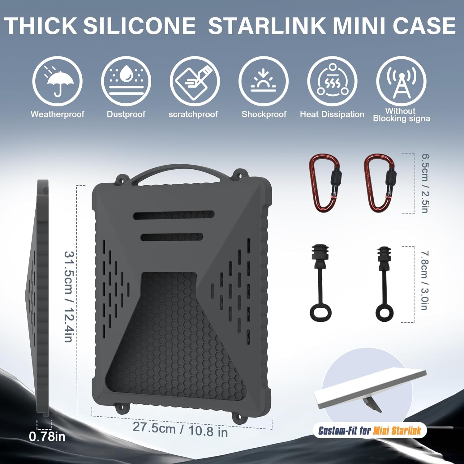 • 【360°Rugged Protection + Portable Mobility】The soft,odorles starlink silicone sleeve creates a form-fitting, non-slip barrier for the Starlink Mini, protecting against daily wear,accidental drops and extreme outdoor conditions.Built-in handles and hooks, plus 2 free carabiners,allow easy attachment to backpacks or gear.Honeycomb lining and ventilation holes ensure signal strength and heat dissipation remain unaffected, while cleaning is effortless—just rinse with water