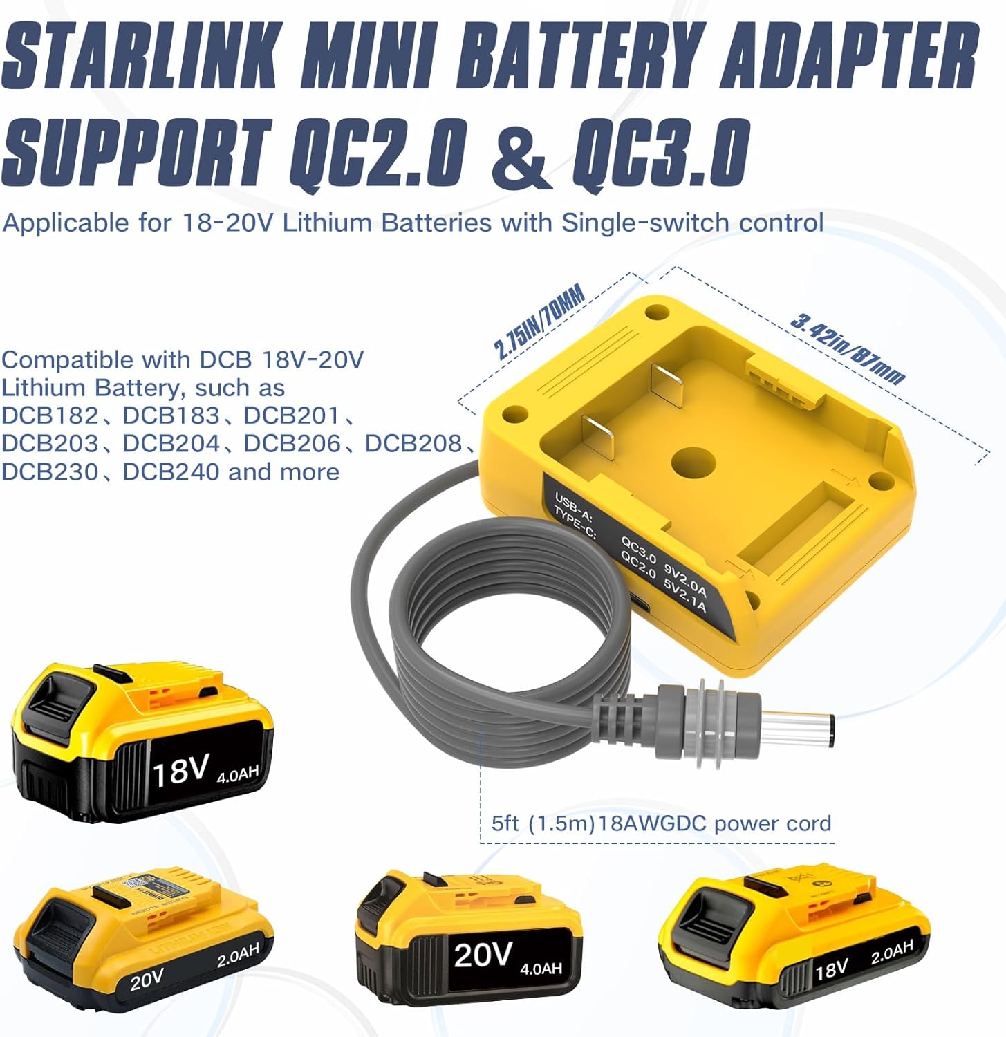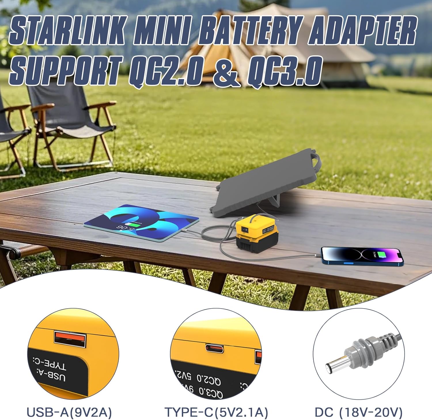 • 【Multi-Port Fast Charging】Battery Adapter compatible with Dewalt for starlink mini doubles as a portable power hub,featuring dual USB-C ports supporting Qualcomm QC2.0/QC3.0 fast charging (5V-12V, max 18W output). While powering the Starlink Mini, it can simultaneously charge your phone,tablet,or small camping fan—eliminating the need for extra chargers during your adventures. The 1.5-meter (4.9-foot) 18AWG shielded tinned copper core DC cable delivers stable power with a maximum output of 100W for reliable performance