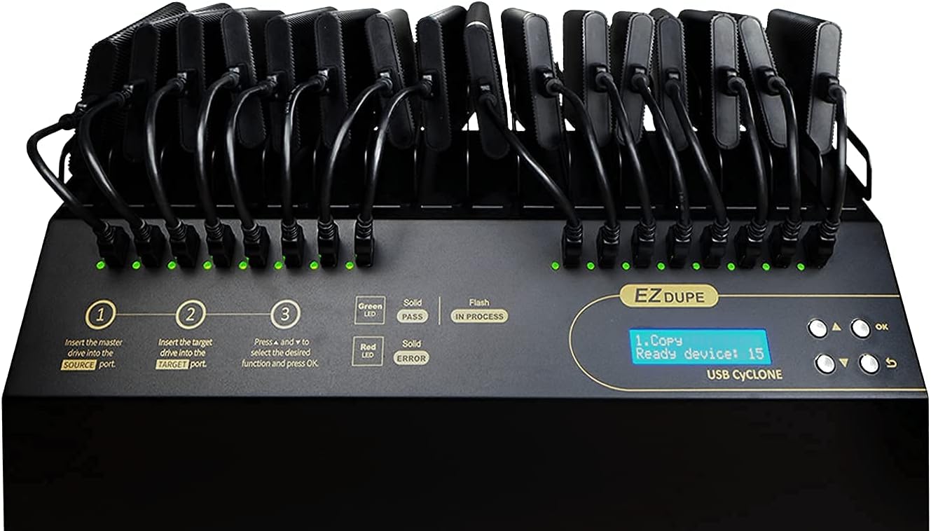 EZ Dupe has done it again!With continual new innovations, EZ Dupe offers the newest line to their USB family.USB Cyclone is the newest line that combines the high speed performance at 45mb per second. Including all capacity size for external USB devices above 2TB!USB Duplicator that is Advanced asynchronous duplication which means no waiting and no interruption as each channel can independently load, unload, and copy. This is a fully standalone USB duplication machine that does not required a computer to operate. High Speed performance that can even handle the most demanding jobs.USB flash drives are used to distribute content or product information at presentations, to customers, internally within the organization or for photos, data, files, videos or music.This USB Drive Duplicator is fast and easy to operate. Advanced asynchronous duplication means no waiting and no interruption as each channel can independently load, unload, and copy.This feature allows each channel to function independently and copies directly from 128MB of built-in memory so there is no need to start and end a copy cycle at the same time. Source Analysis feature identifies the content on the master and intelligently copies only the data to speed up copy cycle. Fast, reliable, convenient and cost-effective to operate, this USB duplicator will help you to get more done in less time!FeaturesSupport up to 15 copies of USB Flash Memory Drives Standalone turnkey system; no computer required. No warm-up and cool-down User friendly interface and simple operation Real-time display of detailed information on bright LCD screen Support all file formats, file size, and card capacity. Support Synchronous and Asynchronous copy modes High speed copy up to 45MB/sec Real time copy and compare technology to ensure successful and complete copies.