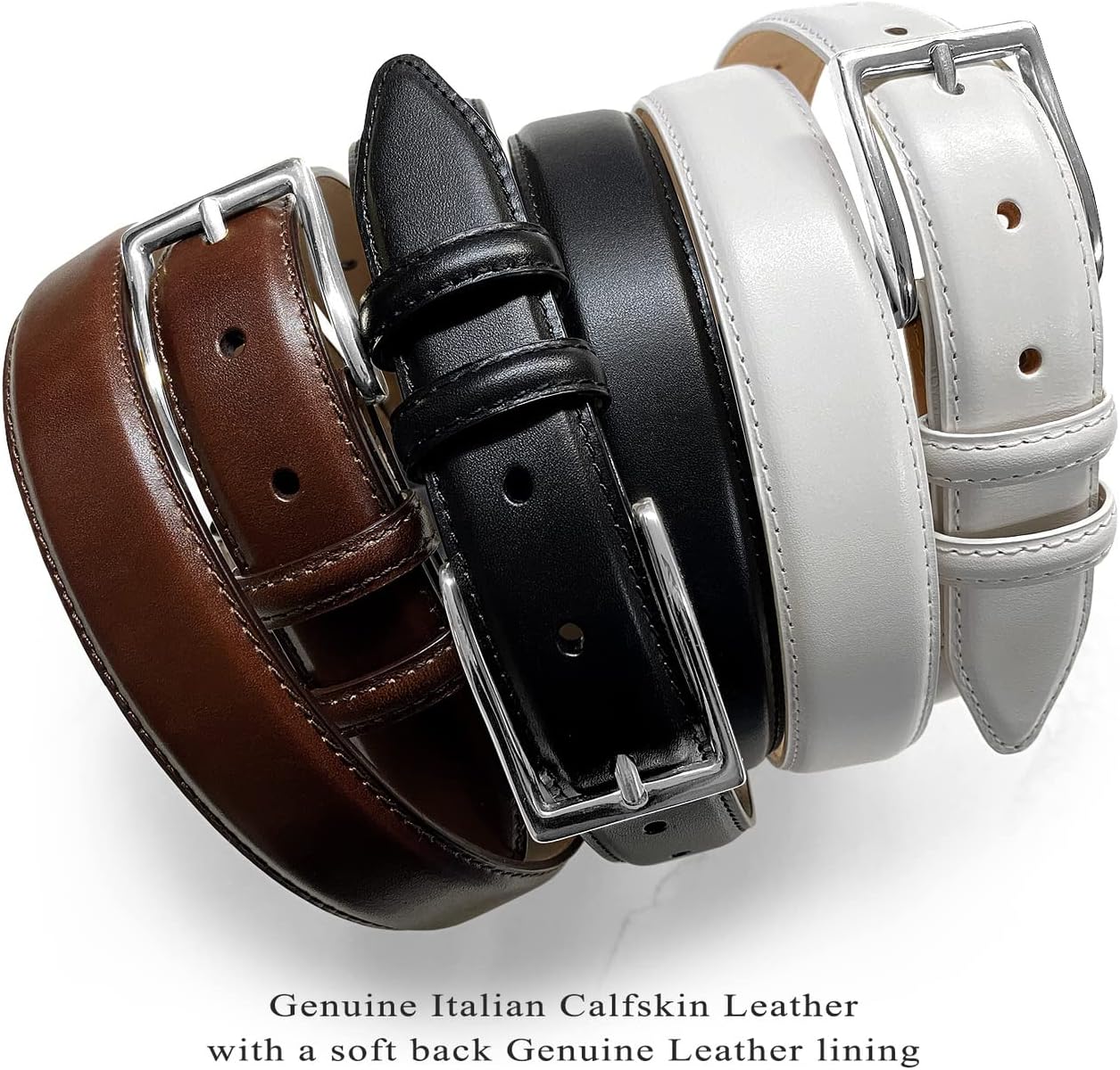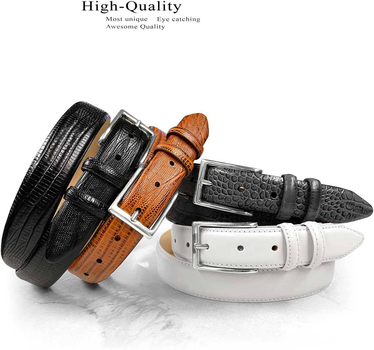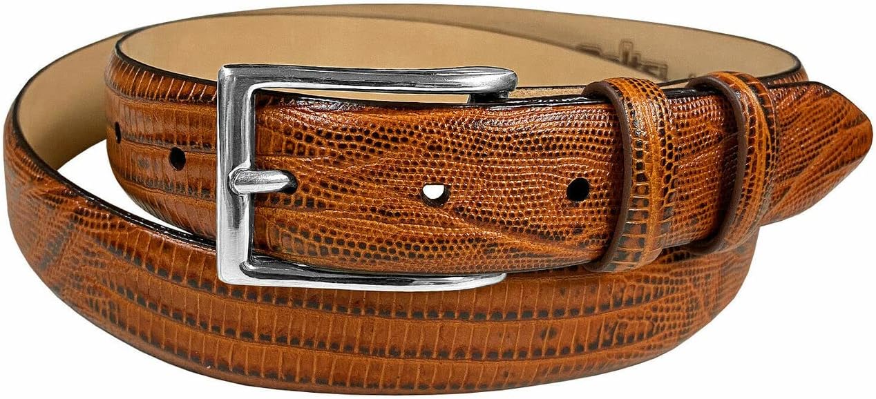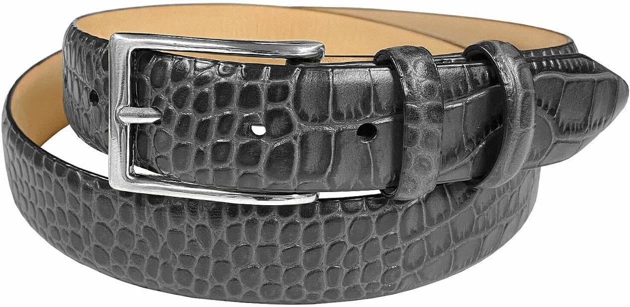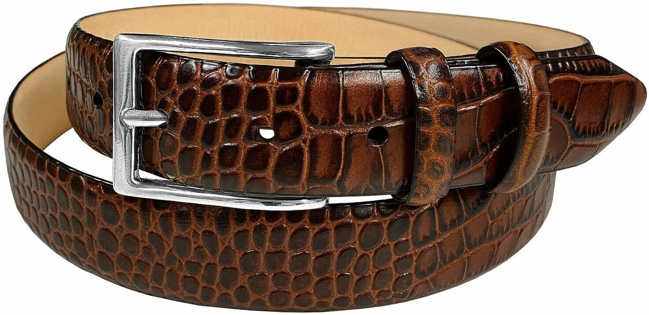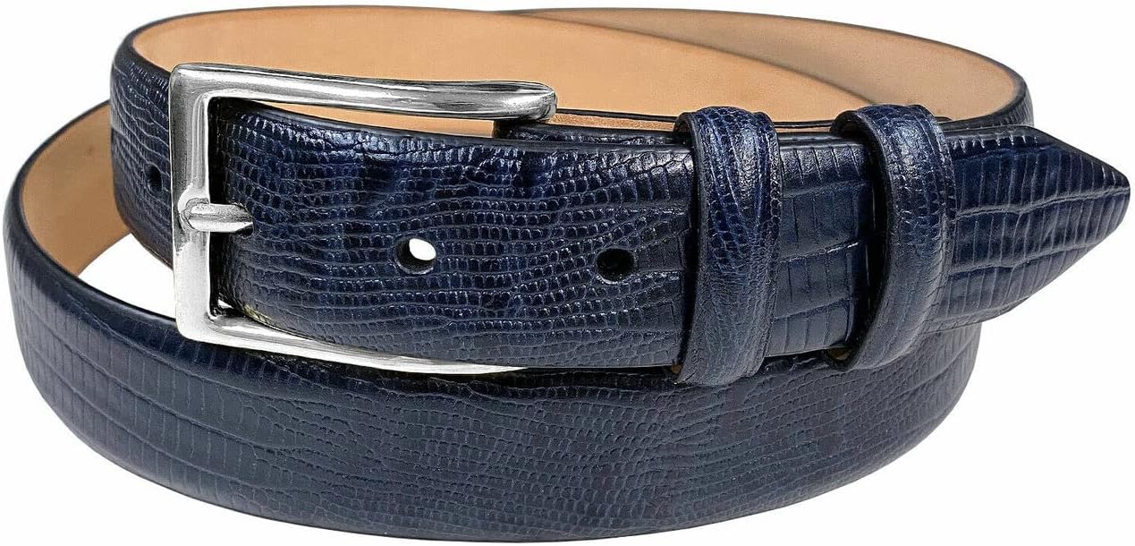 Genuine Italian Calfskin Leather with a soft back Genuine Leather lining.Available in Embossed Alligator, lizard, or smooth style.Designed and assembled in California USA1 1/8" or 30MM wide Solid Brass Buckle in Silver Finish.Our belts are measured from the fold where the buckle is attached to the middle hole, measure around where you wear the belt with your pants on and order the size closest to it.