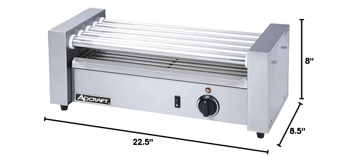 Hot Dog Grill, roller-type, 22-1/2" x 8-1/2" x 8", 5 stainless steel rollers, 360° rotation, 12 hot dog capacity, 304 stainless steel construction, 120v/60/1-ph, 400 watts, 3. 3 amps, NSF, CE