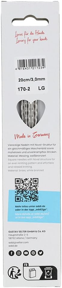 Addi Novel Quintet double pointed needles by Addi have been updated and are now available without a transition piece in the middle of the needle. This guarantees even more knitting comfort. The needles are made of gray-white brass, a material that makes even the thicker needles very light. They have a square shape with rounded corners and a surface with a certain degree of relief and texture. This combination guarantees both comfortable handling and a gentle hand massage while knitting. This promotes blood circulation and reduces muscle tension and fatigue - beneficial for everyone, but especially for people with arthritis. In addition, the slightly embossed needles prevent stitches from accidentally falling off the needle, while the long and tapered tips make it easier to knit multiple stitches together. In short, these needles are ideal, for example, for socks, leg warmers, wrist warmers or gloves with a hole pattern or relief pattern.