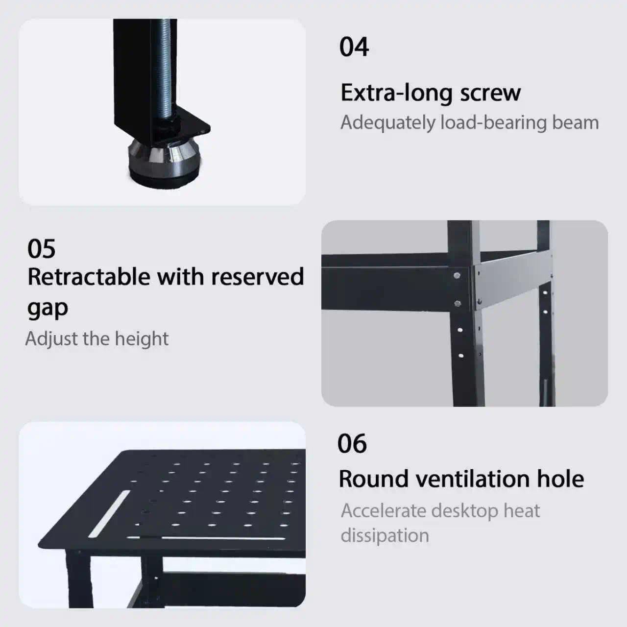 1. Flexible space adaptation The side panels are foldable. When not in use, they can greatly reduce the occupied space, making it convenient to store in narrow passages in the workshop, warehouses, or flexibly adjust the layout of the work area.2. Diverse and practical functions The side panels can be unfolded to expand the operating area, temporarily place welding accessories, tools or semi-finished products; with multi-layer shelves, welding rods, clamps, etc. can be classified and stored, so that tools are within reach and work efficiency is improved.3. Convenient and efficient movement The bottom is equipped with universal wheels, which are easy to push and can be quickly transferred to different workstations to adapt to the flow needs of welding tasks, such as welding of workpieces in different areas of the workshop and multi-project rotation operations.4. Stable and durable structure Made of metal material, with reliable load-bearing performance, it is not easy to deform when placing heavy objects and bearing the impact of the operation during welding, ensuring long-term stable use.5. Optimized operation experience The hole design of the table is conducive to heat dissipation and chip removal, keeping the operation area clean; the reasonable height of the shelf and the angle of the folding side panel are ergonomic and reduce fatigue from long-term operation.