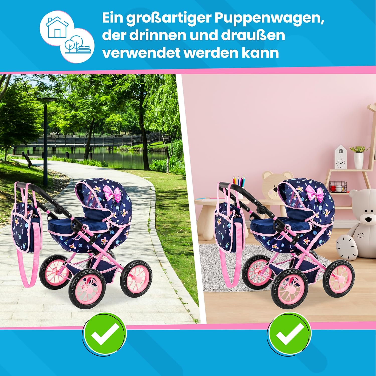 Introduce your daughter to the magical world of make-believe with the Kinderplay Doll Pram, the perfect gift for little girls aged 2 to 6 years and beyond. This charming doll pram features a large tub, foldable hood, and adjustable handle height (12.99 - 24.80 inches), making it an enchanting addition to her imaginative playtime. The Kinderplay Doll Pram is designed to accommodate popular dolls up to 16.14 in tall, such as Baby Born, Baby Annabell, Baby Nenuco, and Baby Kinderplay. Please note that dolls are sold separately. Constructed to be lightweight and stable, the pram is easy for even the smallest children to push, whether empty or filled with toys. Its foam wheels are quiet and won't scratch floors, ensuring a delightful play experience both indoors and outdoors. The adjustable handle height ranges from 12.99 - 24.80 inches, providing a comfortable and ergonomic experience for both smaller and taller girls. This modern and practical baby doll pushchair is thoughtfully designed to grow with your child. To keep the pram looking its best, all fabric elements can be removed and washed at 30°C in the washing machine. This ensures that the pram stays clean and fresh, even after hours of imaginative playtime. Inspire endless joy and creative fun with the Kinderplay Doll Pram the perfect gift for young girls who love to care for their dolls, just like their Mommy!