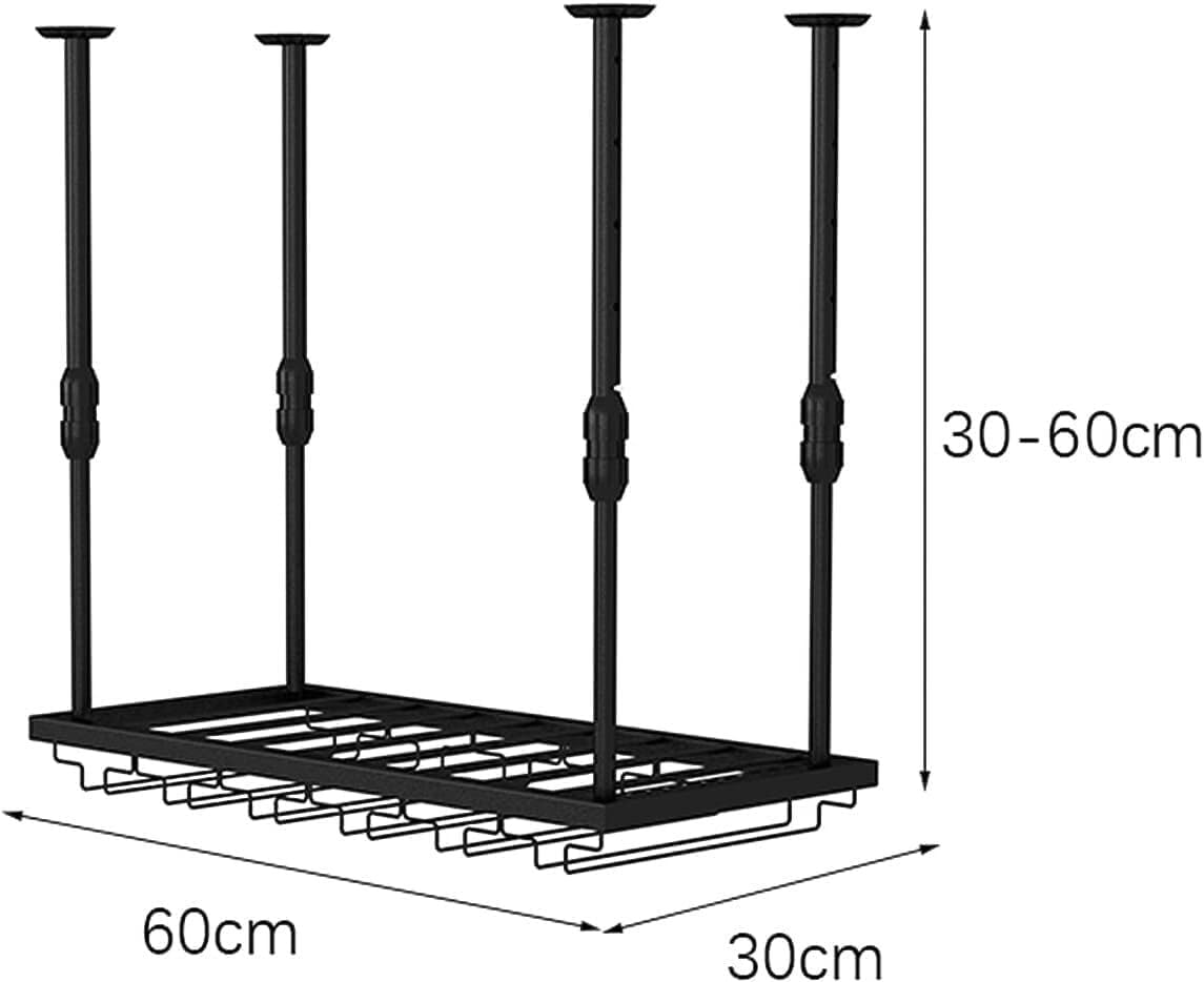 Enhance your space with this Adjustable Hanging Wine Rack, a stylish and functional ceiling-mounted solution ideal for any wine lover’s home or commercial setting. Made from wrought iron, this floating wine rack boasts a retro country design and nano-painted finish that resists wear and rust while adding vintage charm.Available in 60cm or 80cm length options, this wine rack supports both goblets and mugs with its multi-layer storage layout. The adjustable width and height make it suitable for diverse spaces like kitchens, bars, wine cellars, restaurants, and storage rooms. Its ceiling-mounted design not only saves space but also turns your wine collection into an eye-catching display.Material: IronColor: BlackSize Options: 60cm or 80cm length x 30cm widthPackage Includes: 1 x Wine Rack (Goblet Holder or Goblet + Mug Holder)Note: Due to lighting and monitor differences, the actual color may slightly vary. Manual measurements may have minor size deviations.