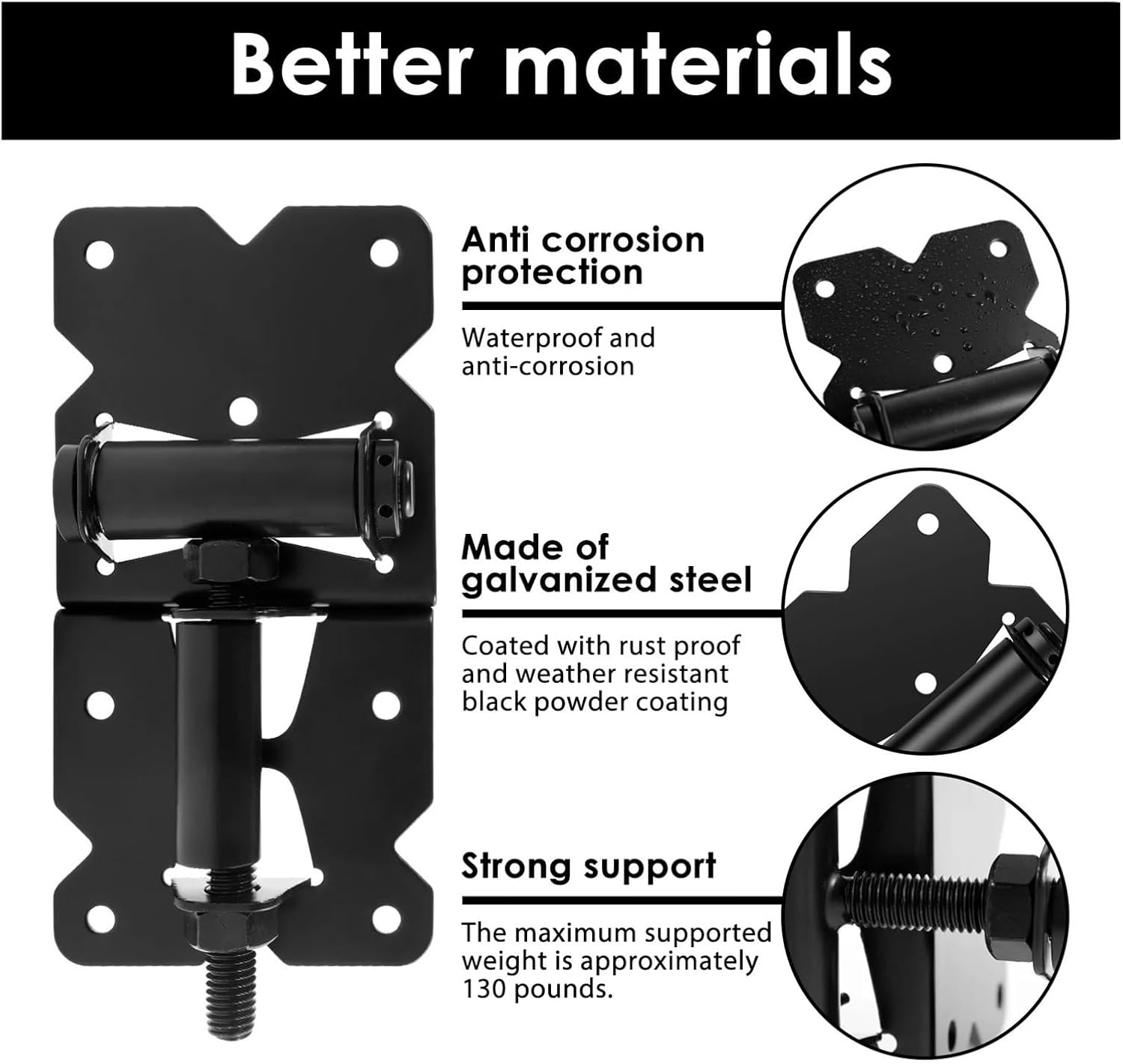1. The door hinge runs smoothly and is designed for quiet operating performance, making it ideal for any commercial or intensively used door2. Strong and durable design makes these interior bi-fold door hinges durable3. Suitable for apartments, offices, dormitories, dormitories, kitchens, etc.Specifications:Product Name: Self-closing Gate HingeMaterial: IronColor: BlackDescription:Self-closing Gate Hinge: Use the swing adjustment tool to insert the stopper (small rod) into a series of small holes around the top of the fence gate hinge to adjust the tension of the spring hinge to the desired angle. Simply tighten the nut to adjust the distance between the gate and the flange.0.23-1.25 inches adjustable: The gap between the gate post and the door frame can be adjusted between 0.23-1.25 inches. Please make sure to leave at least 0.23 inches of clearance. The gate hinge is equipped with a bolt that can be tightened or loosened according to your needs.Iron Material: This gate hinge is made of iron material, which is safe and stable for long-term use. It can easily repair sagging or dragging doors and achieve a good swing door.Wide Application: Our wooden door hinges are highly safe and reliable, perfect for sheds, cabinets, wooden doors, fences, outdoor garden doors, schools, homes, playgrounds, and hotels and resorts.Packing list:2pcs hinges1pcs adjustment rod28pcs screws
