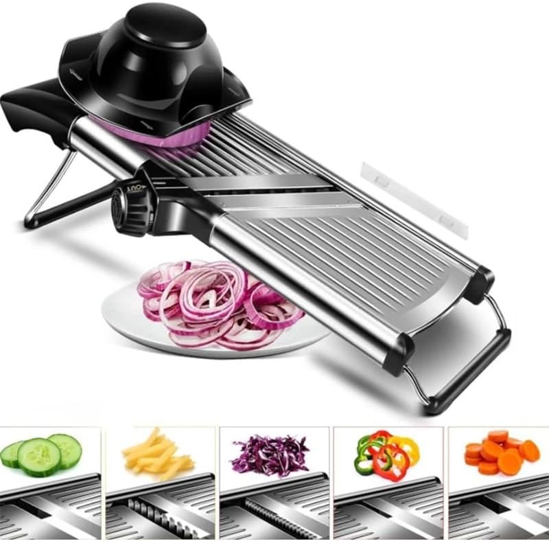Make food preparation faster and easier with this adjustable stainless steel mandoline vegetable slicer. Designed with sharp stainless steel blades, this kitchen tool allows you to slice vegetables and fruits with precision and consistency. The adjustable thickness control helps you create thin or thick slices depending on your cooking needs. Whether you're preparing potato chips, cucumber salads, onion slices, or vegetable garnishes, this slicer delivers professional results every time. For added safety, the slicer includes a protective hand guard and cut-resistant gloves to reduce the risk of accidental cuts. Its durable stainless steel construction ensures long-lasting performance while remaining easy to clean and maintain. Compact, efficient, and versatile, this mandoline slicer is an essential kitchen gadget for quick meal preparation.