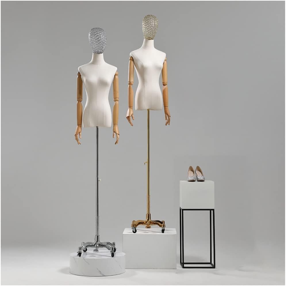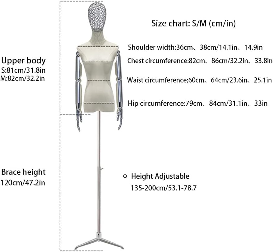 Elevate your retail space with our versatile mannequin stand, specifically designed to enhance product displays in various settings. Whether you’re showcasing clothing in a store window, presenting items on a counter, or creating an eye-catching tiered display, this mannequin stand is an essential tool for attracting customers and boosting sales. **Key Features:** 1. **Adjustable Height:** Easily customize your display with a height adjustment range of 135-200cm (53.1-78.7 inches), ensuring it fits your specific needs. 2. **Versatile Usage:** Perfect for clothing stores, home crafting, fashion design, and educational settings such as hobby classes and training courses. **Product Information:** - **Product Name:** Half-Scale Female Mannequin Body Torso - **Materials:** Crafted from durable FRP and metal, featuring a stylish linen fabric finish. - **Easy Assembly:** Designed for quick setup, ideal for busy retailers and events. - **Additional Features:** Liftable design for effortless height adjustment. - **Base Options:** Available in elegant gold and silver finishes to suit your aesthetic. **Size Dimensions:** - **Small (S):** Shoulder Width: 36cm (14.1in), Chest: 82cm (32.2in), Waist: 60cm (23.6in), Hips: 79cm (31.1in). - **Medium (M):** Shoulder Width: 38cm (14.9in), Chest: 86cm (33.8in), Waist: 64cm (25.1in), Hips: 84cm (33in). **Included in the Package:** - Model Stand x1 **Note:** Please allow for a slight measurement error of 1-3cm due to manual measuring. Should you have any questions or require assistance, feel free to reach out, and I will respond promptly. Transform your display and create an inviting shopping experience with our mannequin stand, blending functionality and style seamlessly.