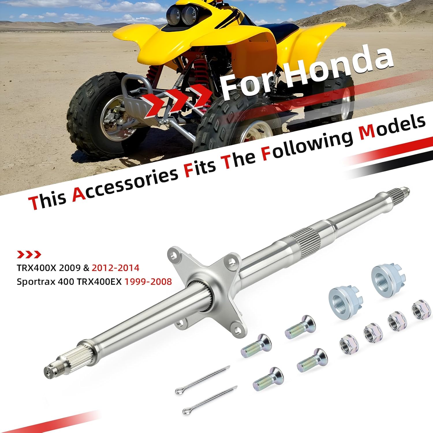 Package: Rear Axle Shaft x 1 Nut x 2 Pin x 2 Rear Sprocket Bolt x 4 Rear Sprocket Nut x 4 Manufacturer Part: 42310-HN1-A40 42310-HN1-000 90304-HM5-A80 94201-40300 This Accessories fits the following models: For Honda Sportrax 400 TRX400EX 1999-2008 TRX400X 2009 & 2012-2014