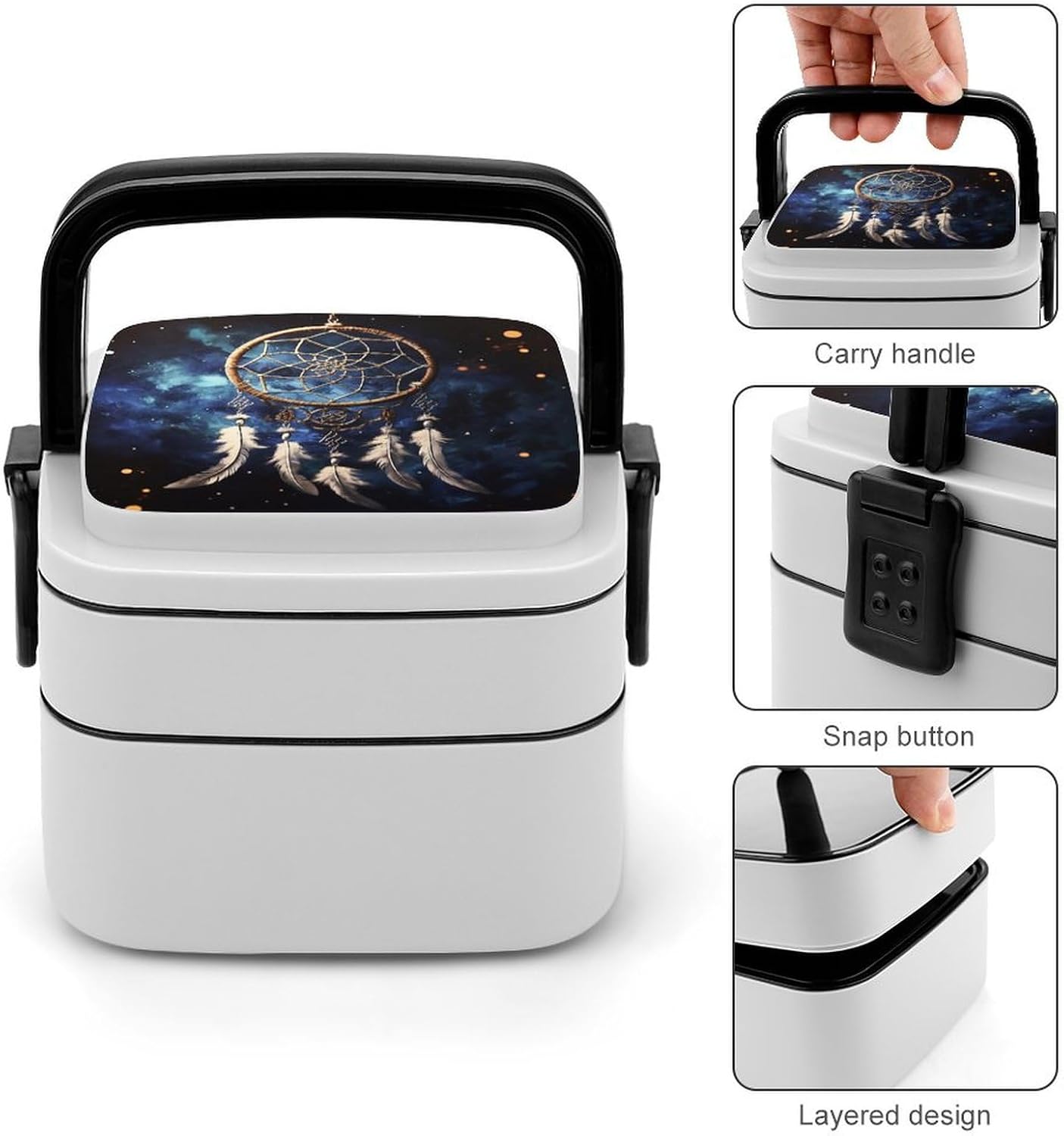 This box adult Bento Box is a must - have for those who are always on the go. Made from high - quality PP material, it's not only sturdy but also safe for storing foodThe double - layer design:lunch box large for women The tight - fitting seal ensures that no food leaks out, whether it's a juicy salad or a soupy dish. Plus, it keeps the food's smell inside, so you don't have to worry about any unpleasant odors in your bagThe clever divider design is another highlight:White Fantasy Dream Catcher cooler lunch box It allows you to neatly separate different types of food. You can put your fresh vegetables in one section, fruits in another, and some snacks in the third. This way, each food item retains its original taste, giving you a wonderful dining experienceCarrying this bento box is a breeze:modern bento The snap - lock mechanism makes it easy to open and close, and the attached handle means you can carry it around effortlessly. Whether you're going to work, on a camping trip, or just out for a day of fun, this bento box is your perfect companionadult bento:Suitable for traveling, taking meals to work, taking fruits, camping and traveling, very light and portable. Washable and reusable. [Special Instructions] Note: This product cannot be put into the microwave