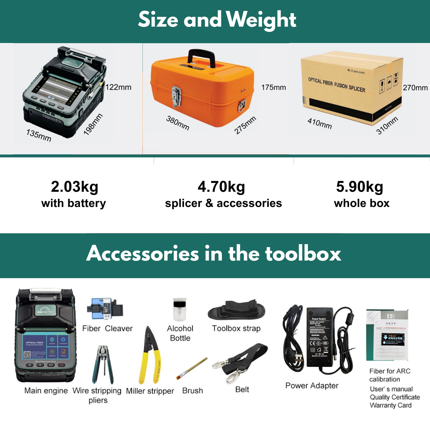 | Included Components | Fusion Splicer, Fiber Cleaver, Fiber Stripper, User Manual, Carry Case |