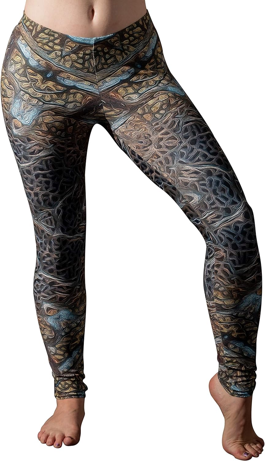 About our Humans and our Machines:-Our artwork is created by a mixture of biological (human) and artificial (computer) neural networks-Our artificial neural networks are run on AWS servers which are treated humanely and occasionally fed pictures of grass-fed organic produce. However, to our knowledge, they will probably never experience sunlight.-Our humans occasionally experience sunlightAbout our LeggingsOur leggings are high quality.They're very comfortable and durable. They're excellent for adventures, festivals, climbing, acrobatics, yoga, and surfer customers have told us they work well as rash guards.Our leggings are made with four-way mid-weight stretch microfiber yarn that stretches and recovers on the cross and lengthwise grains Material: 82% polyester / 18% spandexSize guideOur leggings are great for both men and women, but are sized according to US womens' sizes. XS S M L XLWaist (inches) 25 28 30 35 37Hips (inches) 35 38 41 45 49
