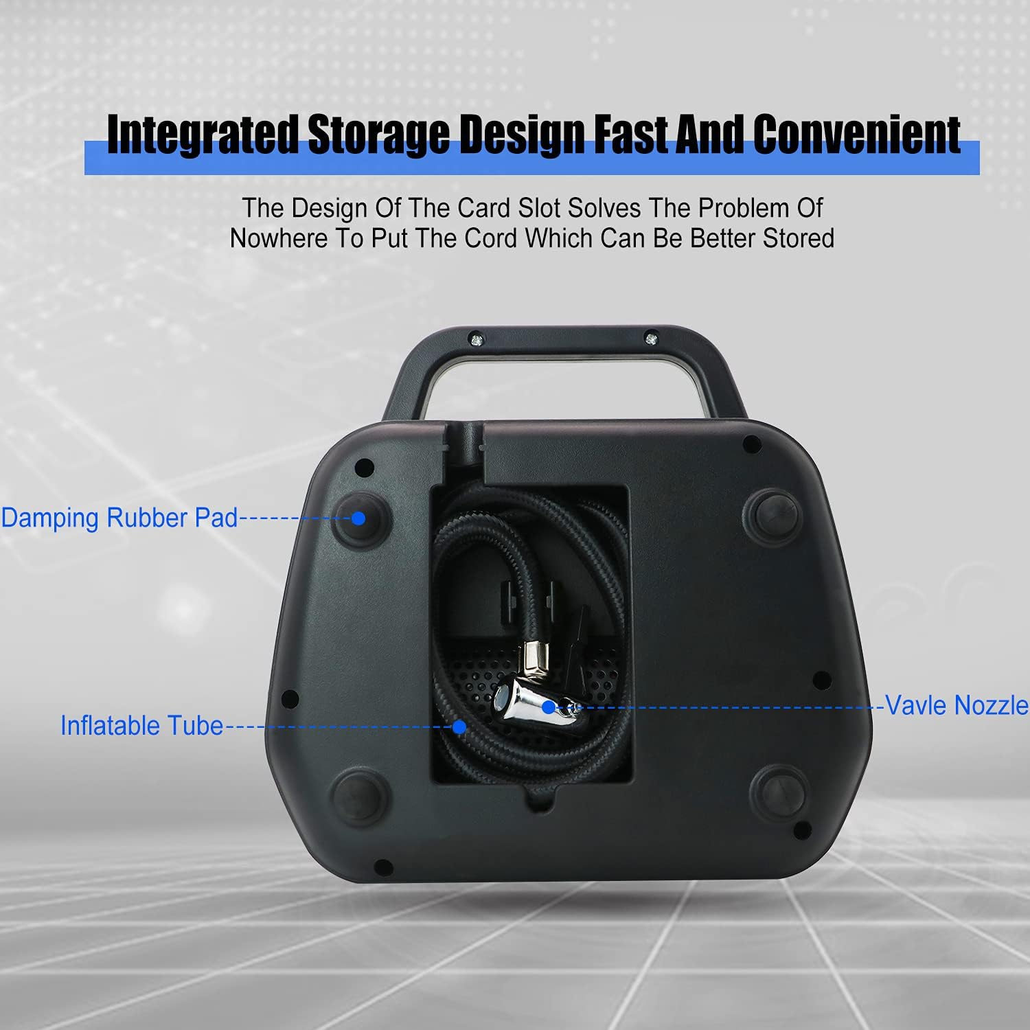 Attention 1. Do NOT use the inflator device continuously for more than 10mins. Allow the unit to cool between use. 2. Press “+”-” After setting up the pressure, you need to wait for the screen to flicker for 3 times, then press the power switch, otherwise, the machine will not start. 3. With AC/DC power cord, you can use indoor or outdoor during travel. 4. Keep inflator out of reach of children and store in a dry place. 5. This item inflates a mid-size car tire in 3~5 mins. 6. Display Units: PSI, kPa, BAR, KG/CM 7. DO NOT leave the inflator unattended when using. Features Voltage: AC 110V / DC 12V Power:120W Material: ABS + Metal Cable Length: AC 5.24 ft / DC 9.18 ft Noise level:<50db Maximum pressure:150PSI Maximum pressure measurement:150PSI Implementation standards:GB4706.1-2005 Package Includes 1 × Digital air compressor 3 × Valve adaptors 1 × AC power cord 1 × DC power cord 1 × User Manual 1 × Fuse