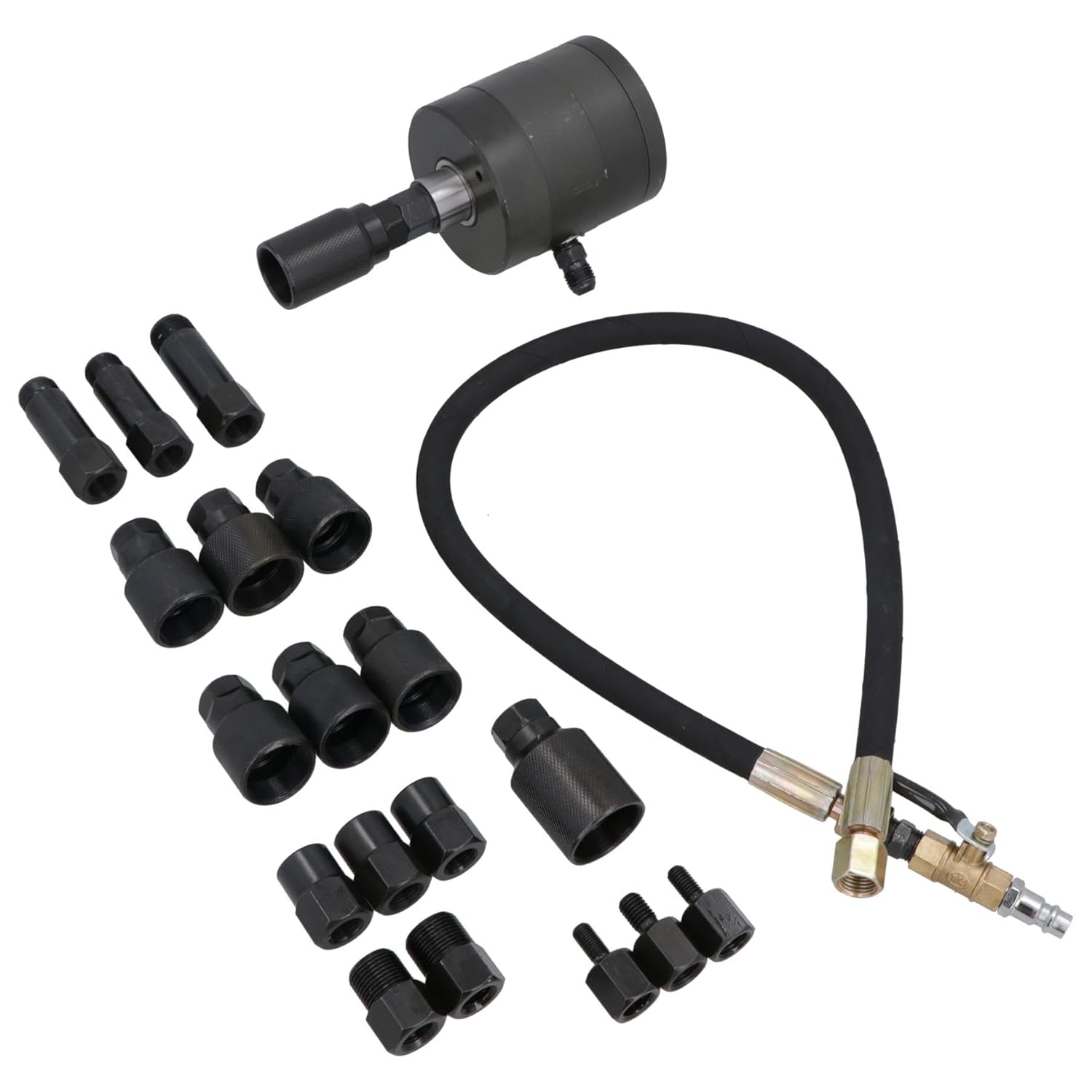 Professional injector remover for commercial or occasional use Pneumatic injector remover tool Used to remove tight or seized injectors Set comprises of a number of adaptors to suit Bosch, Delphi, Denso and Siemens common rail injectors that have solenoid or screw connections Uses vibrations and 20-30 Nm of torque to remove the injectors Requires a working air pressure of between 72 – 116 PSI (5 – 8 Bar) Air / pneumatic powered remover Easy to use, simply select the appropriate adapter for the injector you are removing, attach it to the puller and apply air pressure, this puller will then quickly and easily loosen and remove the injector Removes injectors without damaging the injector or the surrounding area INCLUDES THE FOLLOWING ADAPTERS M8 x 1.0, M8 x 1.25, M10 x 1.5, M12 x 1.5, M16 x 1.5, M17 x 1.0, M18 x 0.75, M18 x 1.5, M20 x 1.0, M20 x 1.5, M22 x 1.5, M25 x 0.5, M25 x 1.0, M26 x 0.75, M27 x 0.75, M27 x 1.0 x2, M29 x 1.0, M31 x 0.75 Comes in a blow molded case for easy storage and transportation