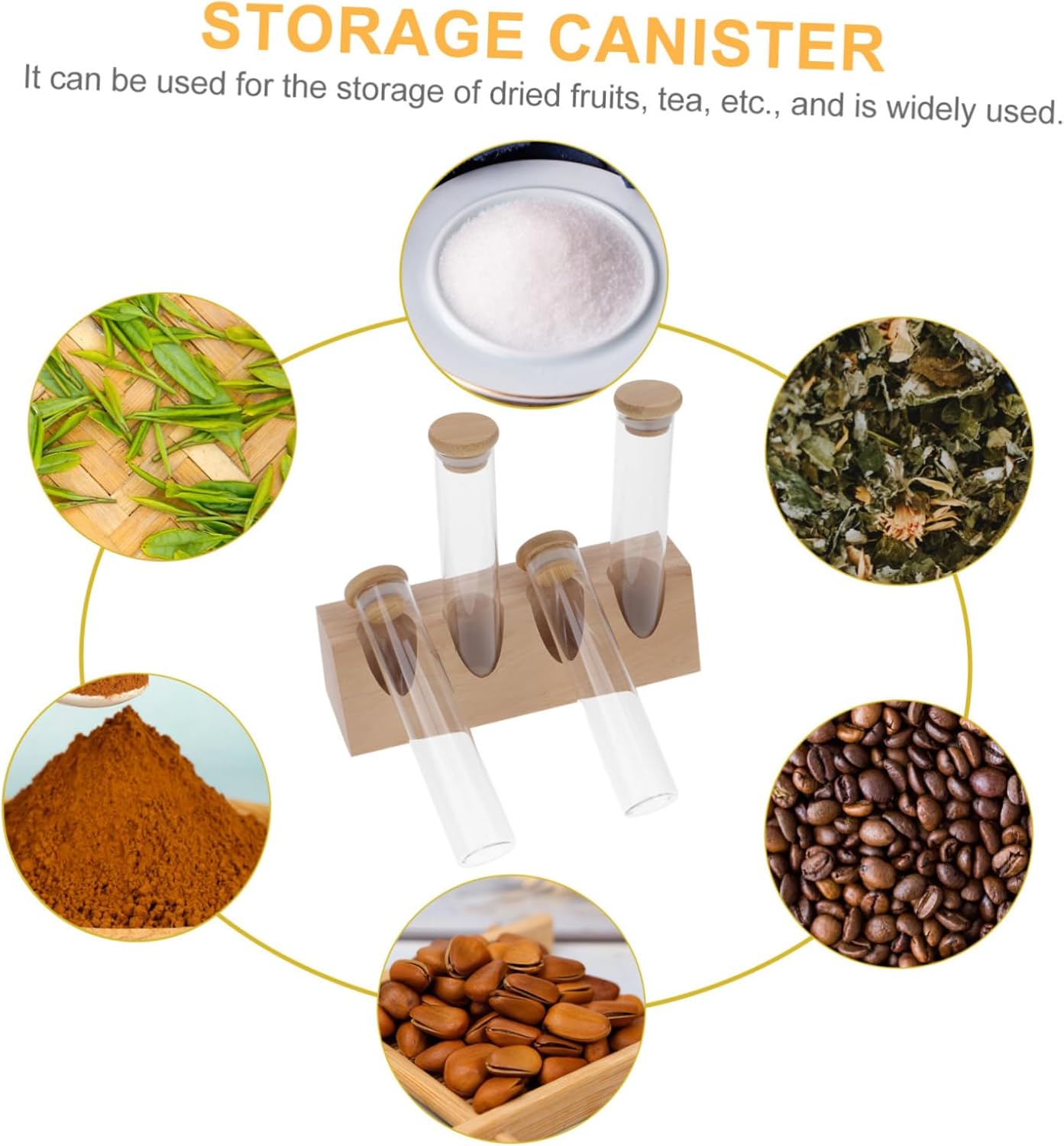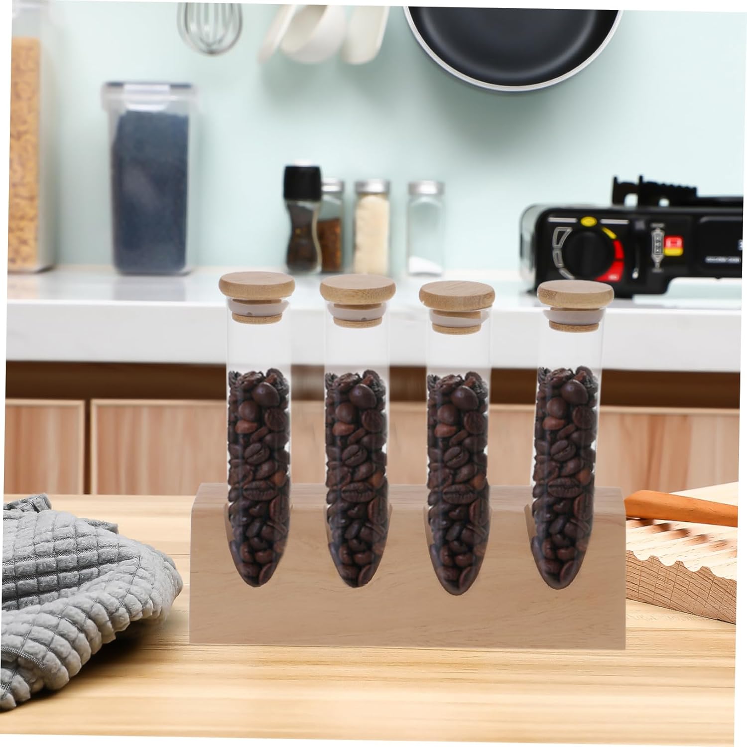 Package Include 4 x Coffee Bean Storage Tubes 1 x Wood Stand Characteristics -Size:20.00X12.00X6.00cm/7.86X4.72X2.36in Coffee Storage Tube -Single glass tube capacity: 70ml Coffee Bean Display Jars -Material:Glass, wood Coffee Bean Tube With Wood Stand -Color:Beige Coffee Bean Storage Tubes - The wooden stand can both help you to store these glass coffee bean tubes, and also suitable for display use Coffee Storage Tubes. - This set of coffee beans glass tubes with wood stand can be present to your friends or families who love drinking coffee Coffee Glass Tubes. - The glass tubes adopt thread on lids, which make them have sealing effects, to maintain the freshness and flavor of coffee beans Coffee bean Holders. - The glass tubes are made of glass material, for storing coffee beans and other items, and the display stand is made of wood, sturdy and Coffee Beans Airtight Holder. - Each glass tube can be taken out individually for different use, to store coffee beans, seasonings, beads, and so on Grain Storage Tubes.Goods InformationCoffee Beans Airtight Holder Made of glass and wood material, it is strong and sturdy enough for everyday use, which can be used to organize and store food such as coffee beans, tea leaves, grains etc.Coffee Bean Glass Jar This item is a multipurpose coffee bean storage jars with a sealing lid and wooden stand