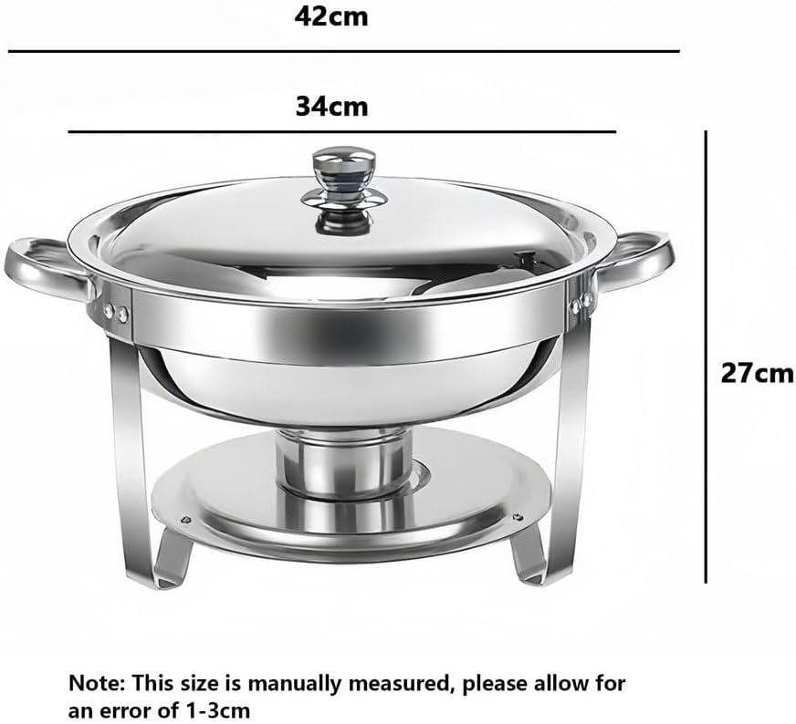 In the cold winter, a hot and delicious meal can warm our body and mind. This chafing dish buffet set is an indispensable tool in this season. The stainless steel chafer can keep the temperature of the food, allowing you to enjoy the food without worrying about it getting cold. Whether you having dinner with family or hosting a party with friends, this round chafing dishes can bring you a comfortable and convenient diningexperience.This buffet warmer sets is suitable for homes, kitchens, restaurants, buffets, hotels, canteens, snack bars, etc. It can keep French fries, rice, chicken, potatoes, pizza, and other dishes at optimal taste.SpecificationMaterial: 304 Stainless SteelShape: RoundNotes1. Please do not touch the surface while the dish is heating to avoid burns.2. Please allow the slight color difference caused by the shooting light and 1-3 cm error due to manual measurement.
