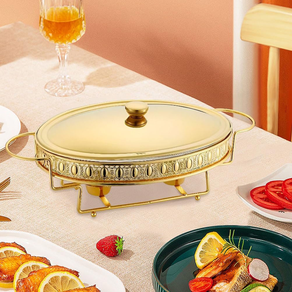 Still worried about how to hold and warm your eleboratly and well prepared food to serve serve large gatherings, events, buffets, parties and self-serve settings? Then this chafing dishes buffet set is perfect for you! The chafing dishes for buffet are suitable for gatherings, events, buffets, hotel breakfast areas, brunches, catering, parties, wedding receptions, and other dining venues.SpecificationsColor: GoldShape: OvalMaterial: Stainless Steel, High-borosilicate GlassProcess: Gold PlatingMount Type: Table StandingAssembly Required: YesCapacity: 2L/2.11qtProduct Size: 42*13.6*22cm/16.5*5.3*8.6in Package Included1* food warmer set