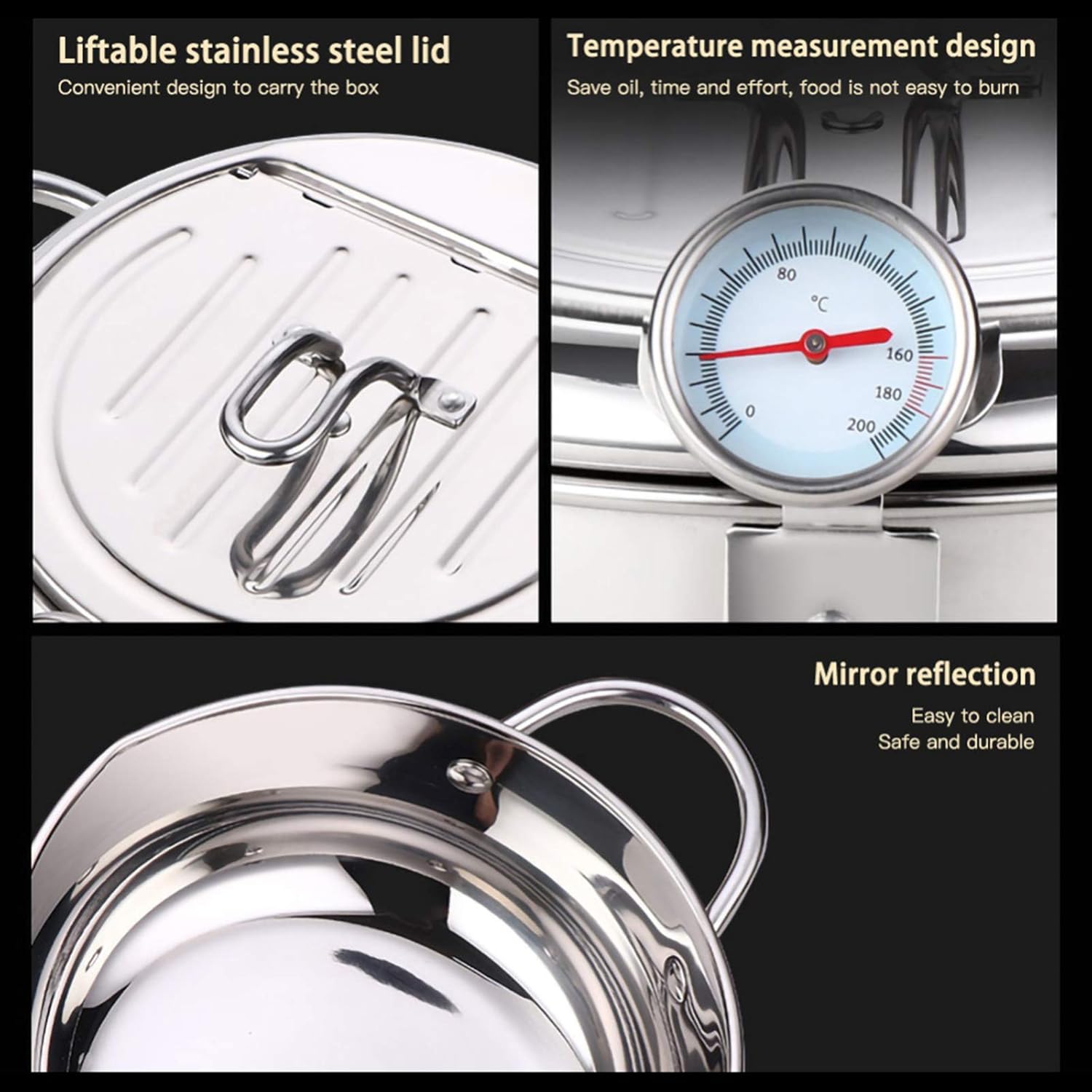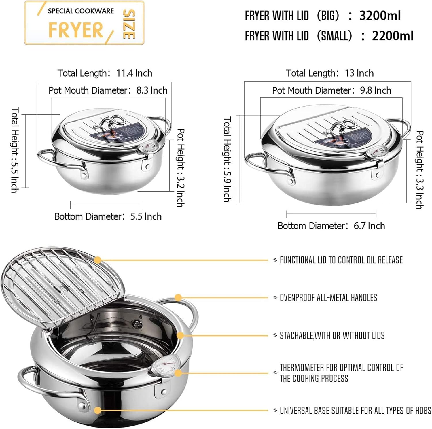 Specification:Material:304 Stainless SteelCapacity:2.2/3.2 littersDiameter:(7.9 inch/20 cm), (9.5 inch/24 cm) Fryer depth(about):3.2inchApplication: universal for induction cooker and gas stoveAccurate oil temperature control can make food more delicious!150°C-160°C French fries, fried potatoes, fried eggplant160°C-170°C Fried sweet potato, fried lotus root, croquette, tonkatsu170°C-180°C Fried squid, fish and shrimp, chicken nuggets, crackersPacking Included:1*Tempura Fryer Pot with thermometer and drain shelfNote:1. Please allow 1-3cm (0.4-1.18") difference due to manual measurement and slight color variation for different display setting.2. Due to the light and screen difference, the item's color may be slightly different from the pictures. Please understand.