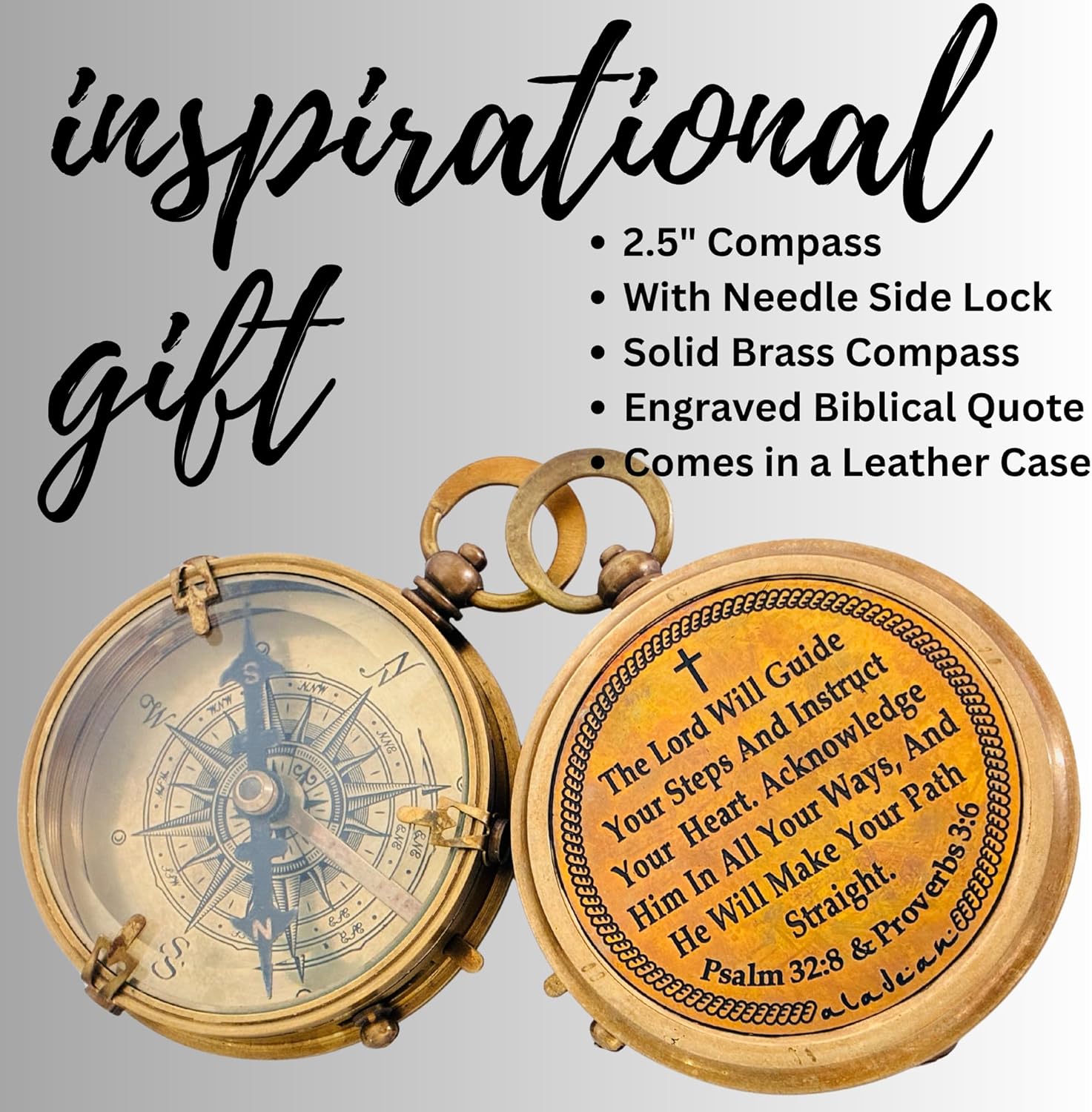 Discover the ALADEAN brass navigation compass, a meaningful blend of practicality and spiritual significance. This beautifully handcrafted 2.75-inch compass features inspirational verses from Psalm 32:8 and Proverbs 3:6 elegantly engraved on its reverse side, reminding us of divine guidance in life's journey. The compass comes complete with a premium hand-stitched leather case and includes a lockable needle mechanism for accurate readings and safe transport. Perfect for both practical navigation and as a cherished keepsake, this compass makes a thoughtful gift for religious milestones such as baptisms, communions, and confirmations. It's equally suitable as a meaningful present for graduations, Christmas, or Thanksgiving. Whether presented to a son, grandson, or any man of faith, this timeless piece combines functionality with spiritual symbolism. The brass construction and quality craftsmanship ensure this compass will be treasured for years to come, serving as both a practical tool and a source of inspiration.