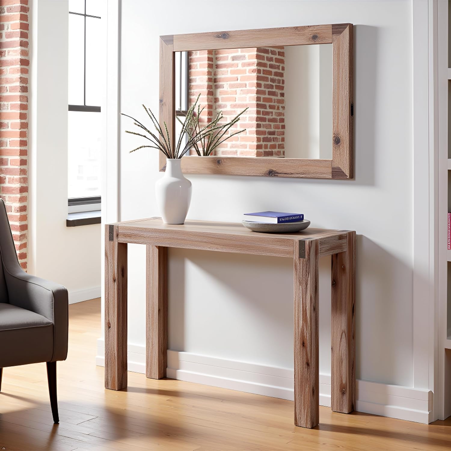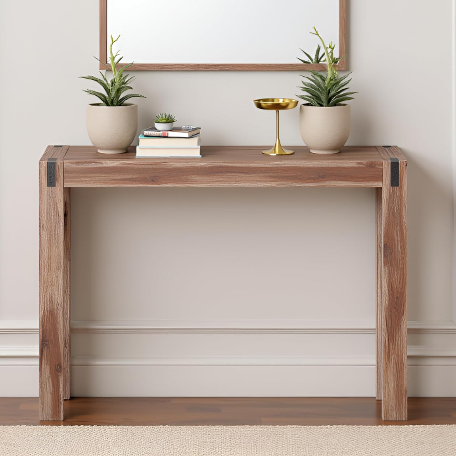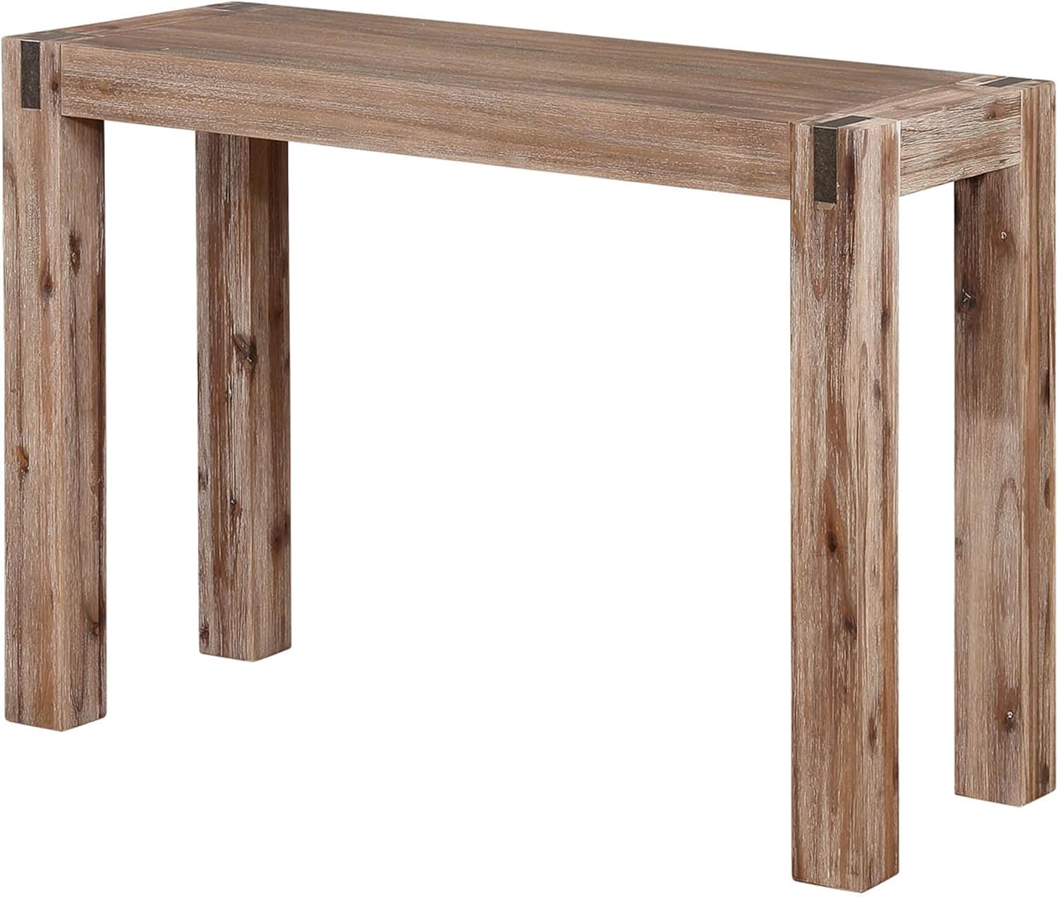 Bring timeless modern farmhouse style to your home with the Alaterre Furniture Woodstock Console Table. Perfectly sized at 40" L x 16" W x 29" H, this compact accent table fits seamlessly in your entryway, hallway, or living room, making it ideal for apartments, lofts, or small spaces. Crafted with solid acacia wood legs, the table offers a sturdy and durable foundation, while the brushed driftwood finish highlights the natural wood grain for rustic elegance. Each corner is accented with a bronze-finish metal inset, adding a subtle industrial touch that complements farmhouse, coastal, or transitional décor. Clean lines and simple detailing create a versatile piece that works as a sofa console, entryway table, or accent table. Whether used alone or paired with other pieces from the Woodstock collection, this console table combines function and style, providing both a practical surface and a statement piece for your home. Perfect for displaying decorative items, holding keys and mail, or adding a welcoming touch to your living space, this table elevates any room with effortless charm. IMPORTANT: Alaterre Furniture is committed to providing the consumer with the absolute best price and value on our entire line of products. NOTE: This is an exclusive product of Alaterre Furniture and ONLY Console Tables by Alaterre Furniture are GUARANTEED to be genuine. Avoid buying counterfeit products and transacting with unauthorized sellers.