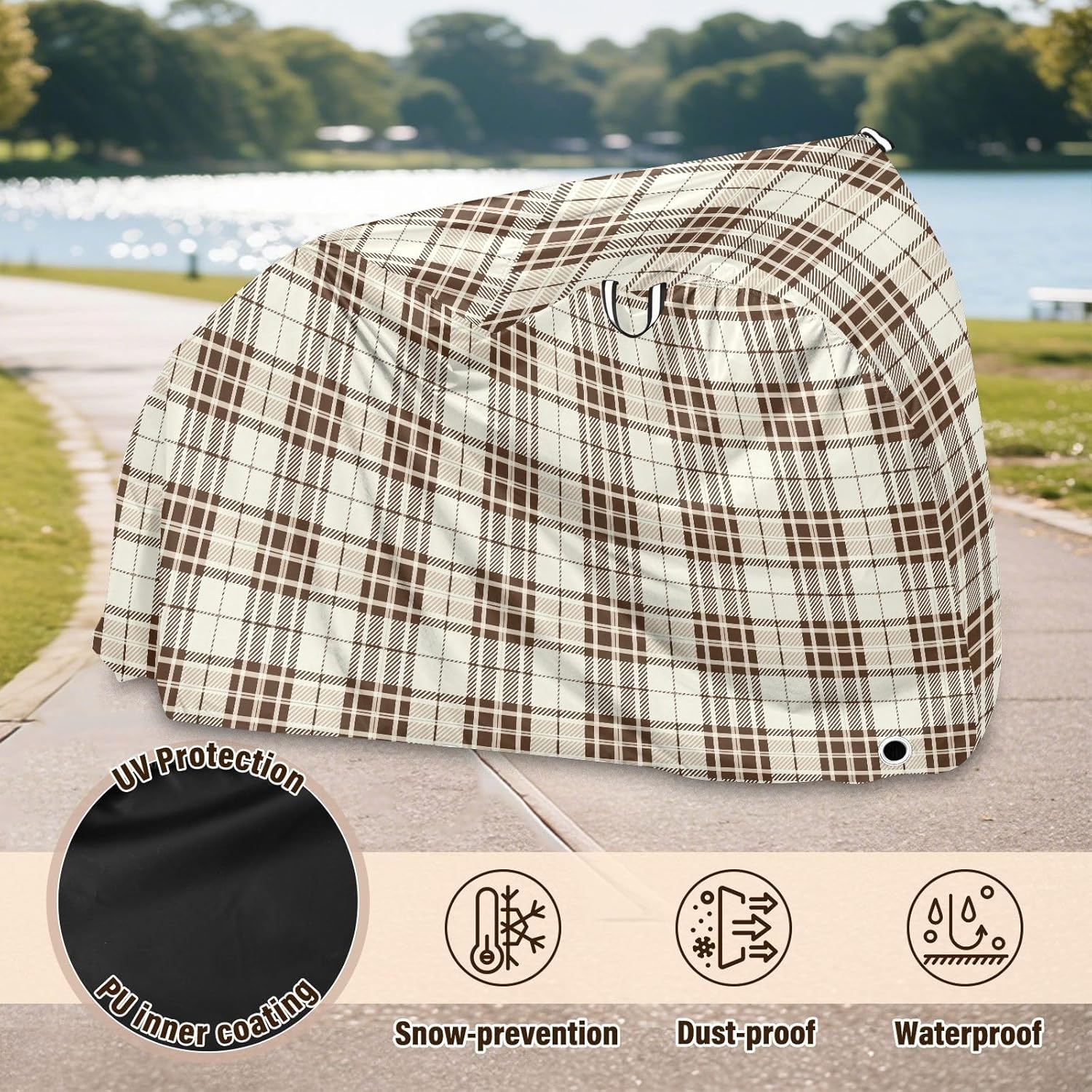 Protect your bicycle in style with our premium bike tarp, engineered for maximum defense against harsh elements. Unlike basic covers, we use specially engineered umbrella waterproof fabric - the same advanced material used in high-end rain umbrellas - delivering superior performance with unique visual appeal. Sun & Heat Defense Our fabric creates a physical cooling barrier that actively lowers your bike's temperature by: Blocking 95%+ harmful UV rays to prevent paint fading Providing exceptional shading & heat insulation (up to 20℉/11℃ reduction vs direct sun) Offering SPF 50+ equivalent protection for sensitive components Rain & Dust Protection Water-repellent coating causes rain to bead and roll off Tightly woven fabric acts as dustproof barrier for long-term storage Prevents moisture buildup with breathable side panels (prevents condensation) User-Focused Design LOCK ACCESS HOLE at front wheel enables secure locking without removing cover ADJUSTABLE BUCKLE STRAP at rear wheel anchors cover during strong winds Reflective safety strips on handles enhance nighttime visibility Ultra-lightweight (23 oz) folds into included pouch Unbeatable Aesthetics Choose from over 1,000 designer patterns - from sleek geometrics to vibrant nature motifs - transforming your bike into a street-style statement while competitors offer only solid colors.