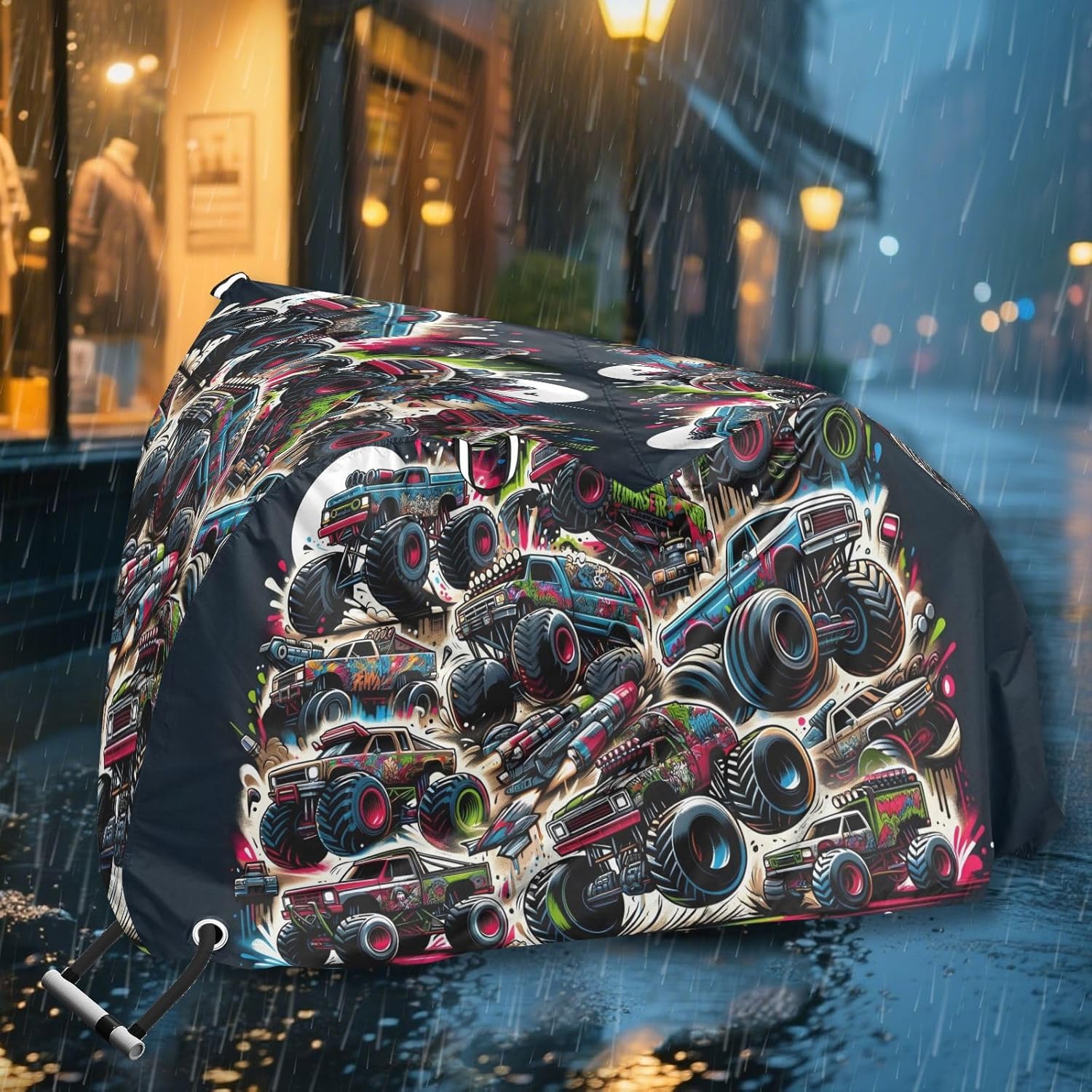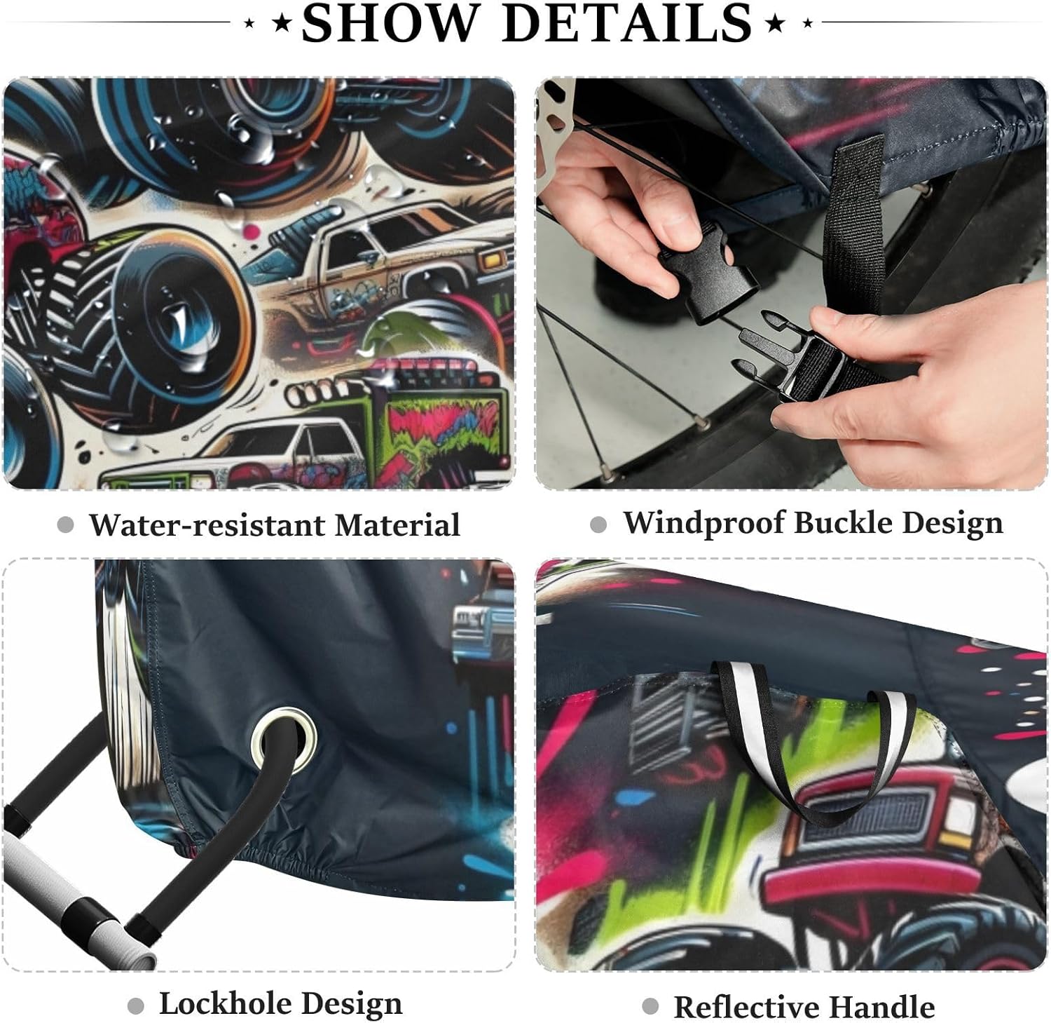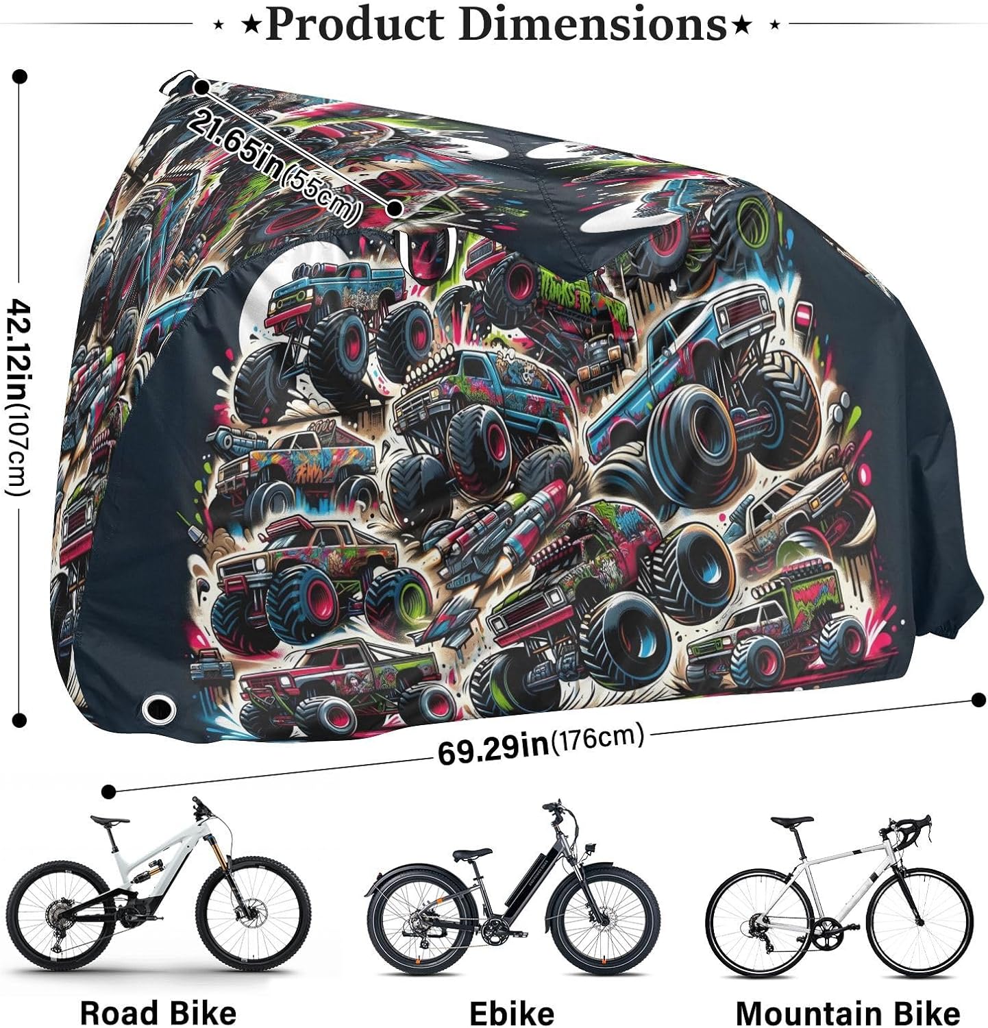 Protect your bicycle in style with our premium bike tarp, engineered for maximum defense against harsh elements. Unlike basic covers, we use specially engineered umbrella waterproof fabric - the same advanced material used in high-end rain umbrellas - delivering superior performance with unique visual appeal. Sun & Heat Defense Our fabric creates a physical cooling barrier that actively lowers your bike's temperature by: Blocking 95%+ harmful UV rays to prevent paint fading Providing exceptional shading & heat insulation (up to 20℉/11℃ reduction vs direct sun) Offering SPF 50+ equivalent protection for sensitive components Rain & Dust Protection Water-repellent coating causes rain to bead and roll off Tightly woven fabric acts as dustproof barrier for long-term storage Prevents moisture buildup with breathable side panels (prevents condensation) User-Focused Design LOCK ACCESS HOLE at front wheel enables secure locking without removing cover ADJUSTABLE BUCKLE STRAP at rear wheel anchors cover during strong winds Reflective safety strips on handles enhance nighttime visibility Ultra-lightweight (23 oz) folds into included pouch Unbeatable Aesthetics Choose from over 1,000 designer patterns - from sleek geometrics to vibrant nature motifs - transforming your bike into a street-style statement while competitors offer only solid colors.