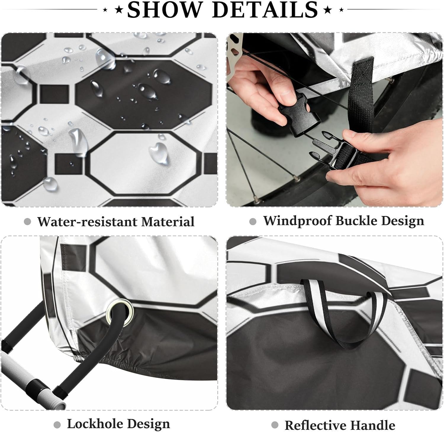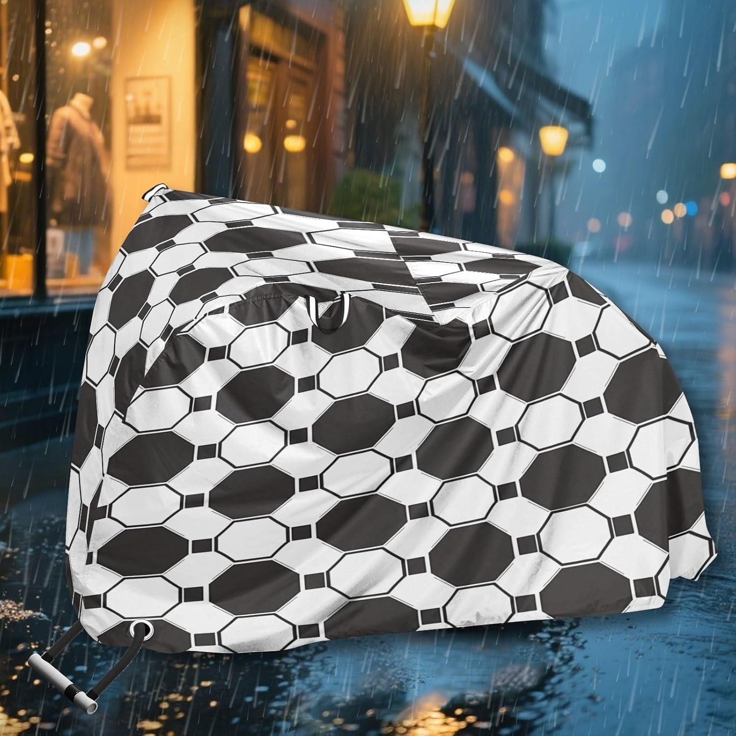 Protect your bicycle in style with our premium bike tarp, engineered for maximum defense against harsh elements. Unlike basic covers, we use specially engineered umbrella waterproof fabric - the same advanced material used in high-end rain umbrellas - delivering superior performance with unique visual appeal. Sun & Heat Defense Our fabric creates a physical cooling barrier that actively lowers your bike's temperature by: Blocking 95%+ harmful UV rays to prevent paint fading Providing exceptional shading & heat insulation (up to 20℉/11℃ reduction vs direct sun) Offering SPF 50+ equivalent protection for sensitive components Rain & Dust Protection Water-repellent coating causes rain to bead and roll off Tightly woven fabric acts as dustproof barrier for long-term storage Prevents moisture buildup with breathable side panels (prevents condensation) User-Focused Design LOCK ACCESS HOLE at front wheel enables secure locking without removing cover ADJUSTABLE BUCKLE STRAP at rear wheel anchors cover during strong winds Reflective safety strips on handles enhance nighttime visibility Ultra-lightweight (23 oz) folds into included pouch Unbeatable Aesthetics Choose from over 1,000 designer patterns - from sleek geometrics to vibrant nature motifs - transforming your bike into a street-style statement while competitors offer only solid colors.