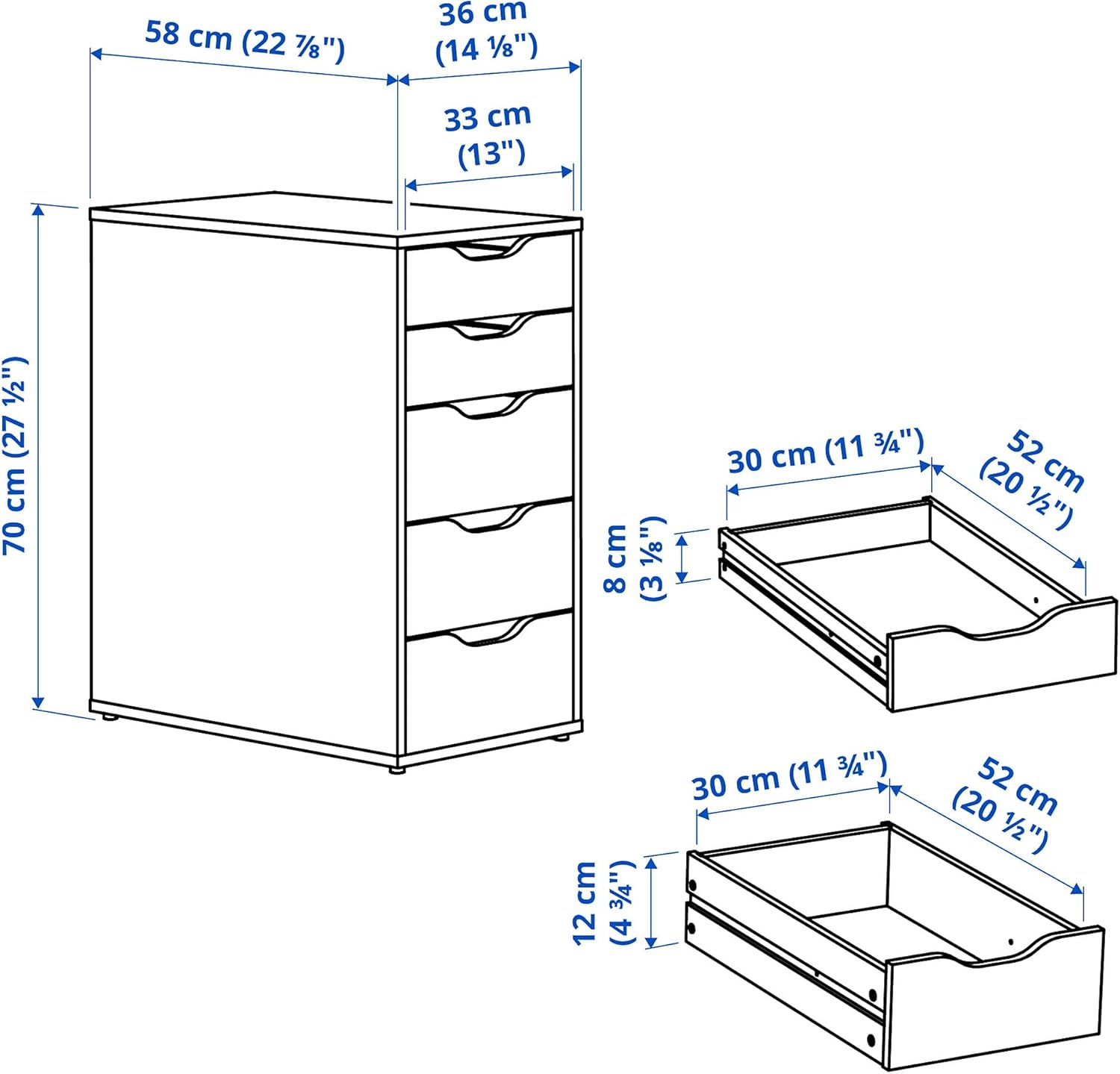 Key Features:Drawer stops prevent the drawer from being pulled out too far. This unit can be placed anywhere in the room because it is finished on the back.Assembled Size:Max. load: 12 kgMax. load/drawer: 4 kgMax. load small drawer: 2 kgWidth: 36 cmDepth: 58 cmHeight: 70 cmDepth of drawer (inside): 52 cmImportant note: For customers ordering from outside of EU, please note, you may be subject to import duty and tax. Please check with your postal or tax office on your import regulations