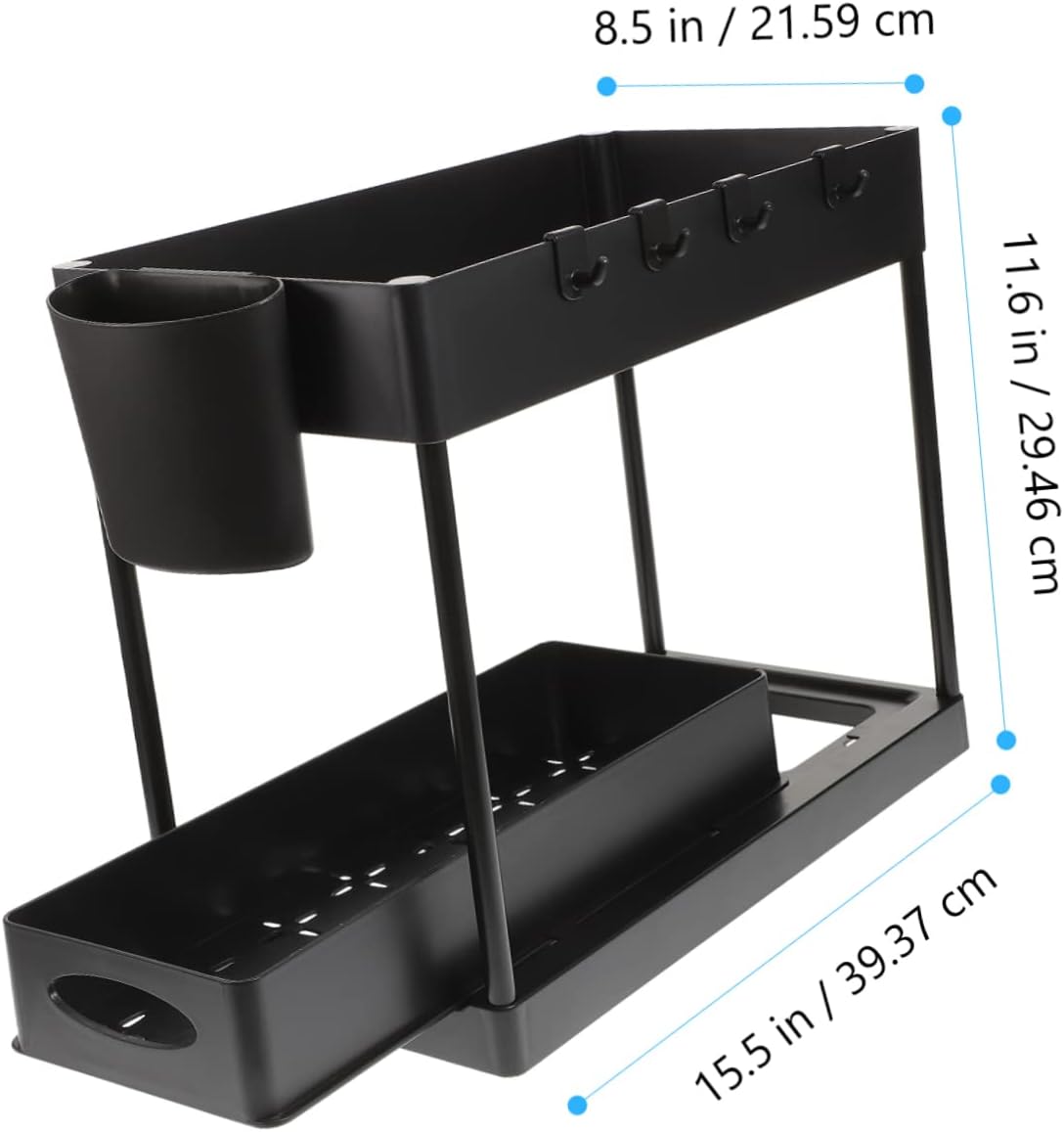 Package Include 1 x storage rack 4 x hooks 1 x storage bucket Features -Color:Black bathroom supplies -Material:ABS storage shelf -Size:39.50X30.00X20.00cm/15.52X11.79X7.86in cleaning supplies organizer - Get rid of the chaos, light in weight, sturdy and stable for storage, not easy to break storage rack. - Not bad substance, make your healthy life more easy, and organizer for you Kitchen Organizer. - Multiple purpose with two layer, it's easy for hanging and storing your items Sink Sundries Storage Holder. - Create a kitchen for you to keep the countertop and dinner table clean and tidy, simple and kitchen storage organizer. - Easy to clean and can maximize the storage space of the kitchen. Place it under sink in the kitchen or can be applied for living room, study, bathroom and so on Sliding Storage Basket.Goods DescriptionBathroom Storage is made of ABS material and can support your long time use.under sink storage organizer The design of it is convenient and won't take too much space.bathroom supplies If you are looking for a and kitchen storage rack, then you should take a look at our product.bathroom organizers It can meet all your need