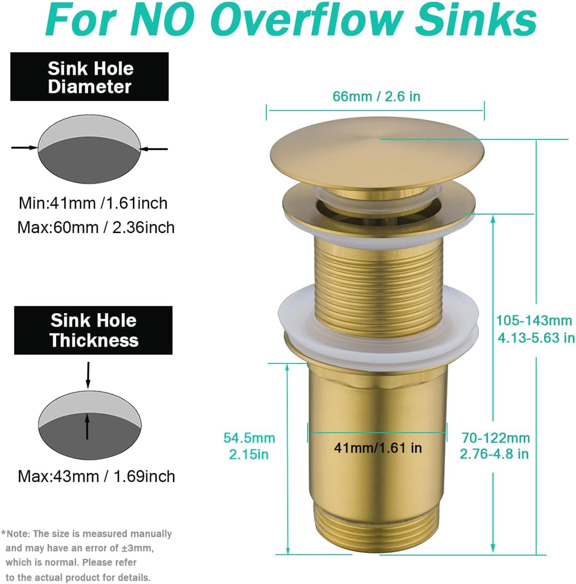 About the product: 1.Brand Name:SEABEFORE. 2.Product Name:Bathroom Sink Drain Without Overflow. 3.Material:solid brass. 4.Model Number:SE83997PB-CB. 5.Surface Treatment:Champagne Bronze. 6.Applicable for:standard US bathroom sink. 7.Anti-clogging:With basket, easy for cleaning. 8.Mounting by bare hand:Extended and thickened, no tools needed. 9.No gluing needed:Stepped gasket instead of glue. 10.Anti-explosion and anti-cracking:Integrally-molded thickened pipe body.