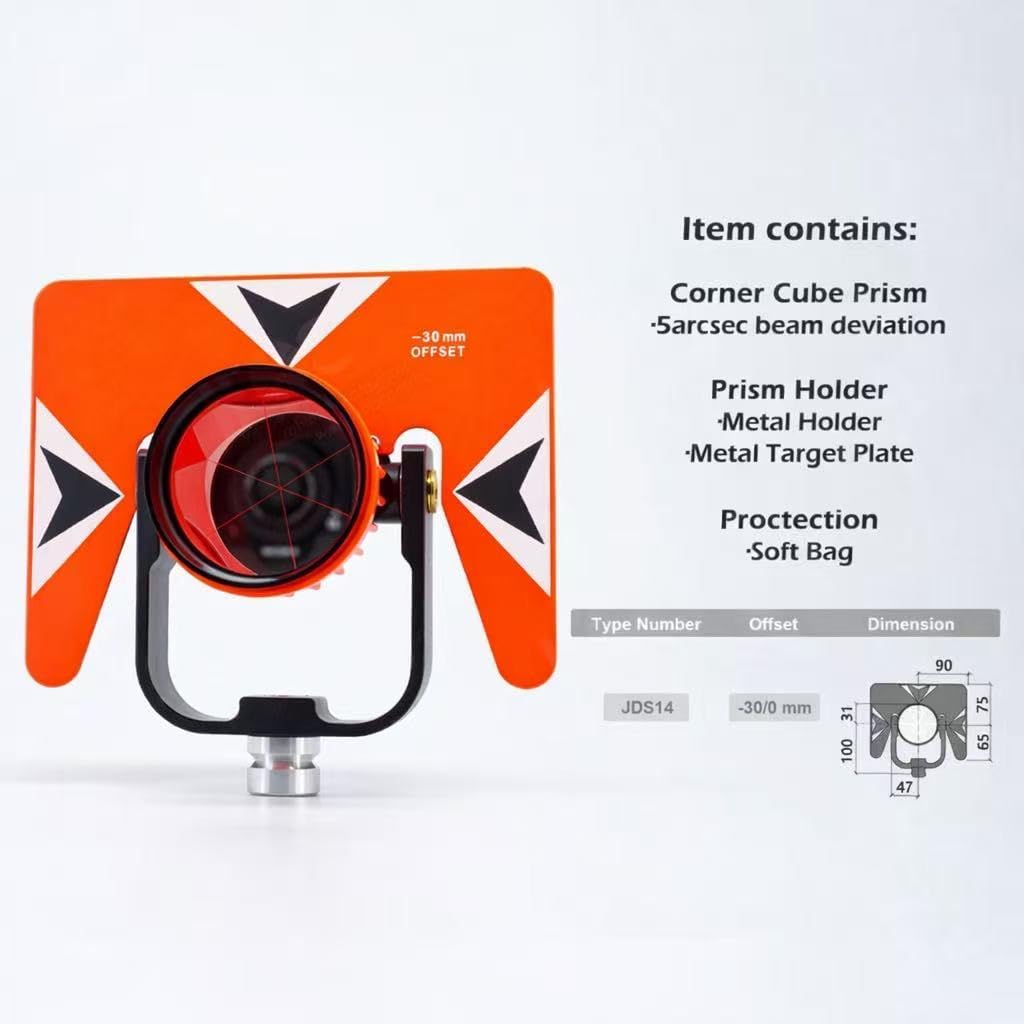 The XGeology Prism is an all metal prism assembly for land surveying in conjunction with total stations. It is fully compatible with leading manufacturers such as Trimble, Sokkia, Topcon, Leica, Nikon, Pentax, etc. The heavy-duty 2 1/2" (62.5mm) diameter silver-coated prism is sealed in a strong canister to prevent water and dust from getting inside and has a 0 or -30 millimeter offset and 2.5 arc second accuracy. The all steel high visibility (flo orange with black and white) target is 5 1/2 x 7 inches (14cm x 18cm) It incorporates a simple locking mechanism with tension adjusting brass knobs that's easy to set while adjusting the prism and target tilt. Stainless steel hardware to resist rust and increase visibility. Its brass thread adapter can be mounted to any 5/8 inch - 11 thread pole or tripod. New orange color 0/-30mm tilt prism set includes padded carrying case, all metal construction, lens cover, 5/8 x 11 bayonet adapter, lock knob and weather proof prism. Will work with all distance measuring devices. Comes with padded nylon carrying case.
