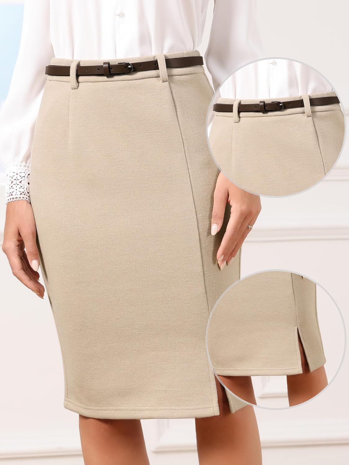 Allegra K Pencil Skirt for Women Knee Length High Waisted Skirts with Slit Elegant Office Work Skirt with BeltElevate your wardrobe with stunning collection of women's skirts designed specifically for women ladies girls. Crafted from soft fabric, the knee length skirt offer a perfect blend of style and comfort. Featuring a flattering high waist design, they are ideal for creating chic spring summer fall outfits for 2026. These versatile high waisted skirts for women can be paired effortlessly with any top, making them a must-have for ladies and girls alike. The bodycon silhouette adds a touch of elegance, while the invisible side zipper ensures a seamless look and easy wear. Whether you're dressing up for formal or keeping it casual, these pencil skirt for women will become your go-to choice. Complete your outfit with a stylish belt to accentuate your waist and make a bold fashion statement. Don't miss out on this essential addition to your closet—shop skirts for women today!