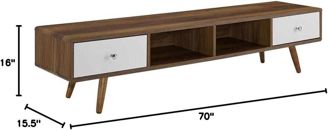 Harness the iconic energy of mid-century modern style with the Allora 70" TV stand. Allora features two spacious full-extension white lacquer drawers, two media storage cubbies with cable management holes, and four splayed and tapered wood legs which further enhance the streamlined profile and sophisticated look of this media console TV stand. Made of durable particleboard and MDF with smooth walnut grain veneer, Allora makes it easy to manage your media needs while keeping your space looking visually clean. Allora is the perfect low profile TV stand for the contemporary home.Features:- Material: Particleboard wood, MDF, KD structure- Finish: Walnut, white- Smooth wood grain veneer- Two media storage cubbies- Durable particleboard / MDF- Two cable management holes- Splayed and tapered legs- Two full-extension glide drawersSpecifications:- Product Dimensions: 16"H x 70"W x 15.5"D- Product Weight: 53 lbs- Product Dimensions: (Table Top Thickness) 1"- Product Dimensions: (Height from Floor to Underside of Table) 7"- Drawer Dimensions: (Inner) 6.5"H x 16.5"W