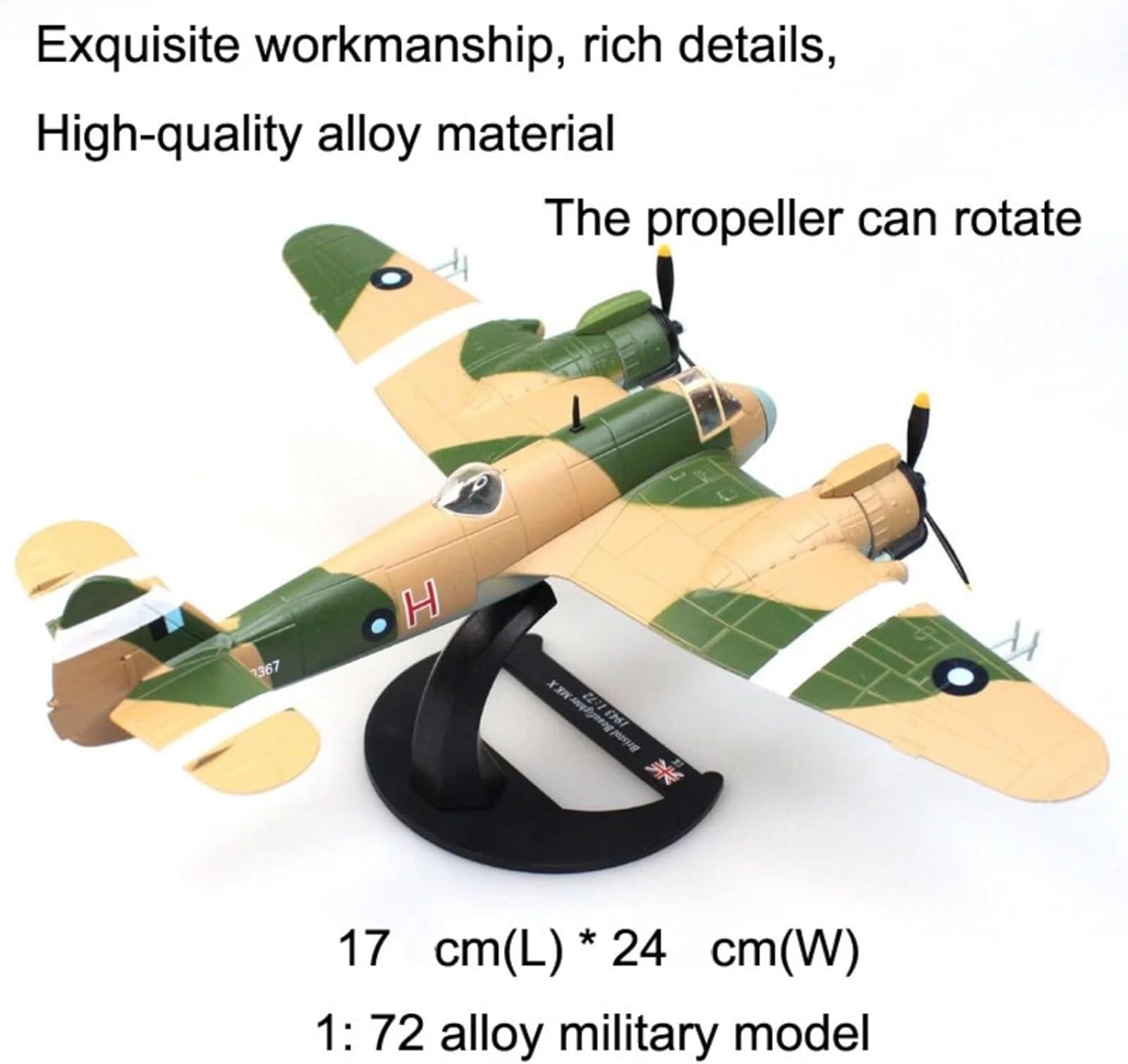 Features: Model Plane: WWII RAF Bristol Beaufighter MK X Fighter Collection Plane: WWII RAF Bristol Beaufighter MK X Fighter Model 1:72 Scale Model Length Is 6.7in Prototype Airplanes: The Model Airplane Is Strictly Restored According To The Original Aircraft Proportions And Details. High Quality Die Cast Alloy Model. Decor Model: Model Plane Is Very Suitable To Decorate Your Desk, Showcase And Shelf. Perfect Gifts: The Great Gift Choice For Birthday, Christmas, New Year To Your Lover, Family And Friends, Also Suitable For Plane Collection Enthusiast. Specifications: Product Model: WWII RAF Bristol Beaufighter MK X Fighter Product Scale: 1:72 Product Material: Alloy+Plastic Product Size: 17cm X 24cm Packaging Includes: 1* WWII RAF Bristol Beaufighter MK X Fighter Model 1* Display Stand