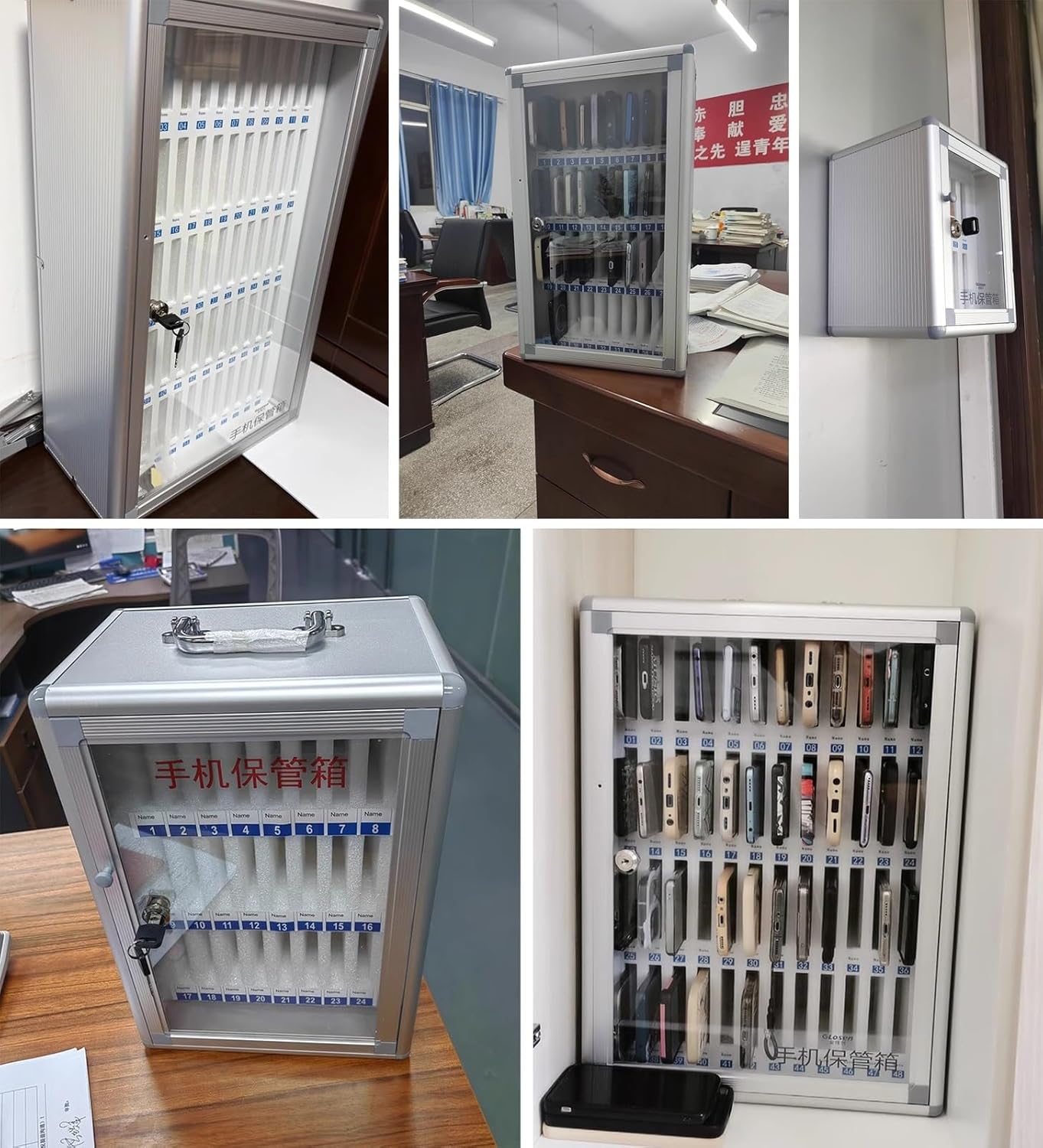 Freestanding Metal Phone Safe Deposit Organizer Box:This classroom phone storage box is an essential tool for enhancing focus and productivity in educational environments. Designed to store mobile phones securely, it minimizes distractions, allowing students to engage fully in their lessons. This practical solution not only addresses common classroom management challenges but also fosters a more conducive learning atmosphere. **Specifications** - Color: Silver - Number of Slots: 12/24/36/48/60 - Special Feature: Lockable - Assembly Required: No - Material: Aluminum Alloy + Acrylic + Pearl Cotton - Mounting Type: Wall Mount/Free-standing - Slot Size: 163 x 13 x 85 mm (6 3/8" x 1/2" x 3 3/8") **Features** - Effortless cleaning for ongoing maintenance - Durable design ensures long-lasting use - Secures cell phones to enhance student productivity - Ready to use out of the box, no assembly needed - Transparent slots allow for easy monitoring - Compatible with a variety of mobile phone models **Package Includes** - 1 x Slots Cell Phone Locker - 2 x Keys - All necessary installation accessories **Important Notes** - Please verify the dimensions to ensure compatibility with your needs. - Keep the keys in a safe location to prevent loss. - Manual measurements may result in slight size variations of 1-2mm. - Color may vary slightly due to monitor differences; please refer to the actual product. **Customer Service** - For any inquiries about our products, feel free to reach out via email. We aim to respond within 24 hours to address your concerns and provide satisfactory solutions. Elevate your classroom experience with this phone storage box, designed to support educational excellence and effective management.