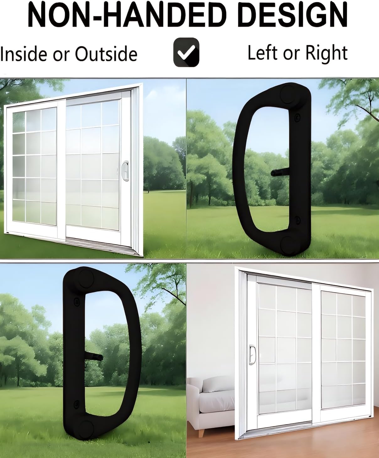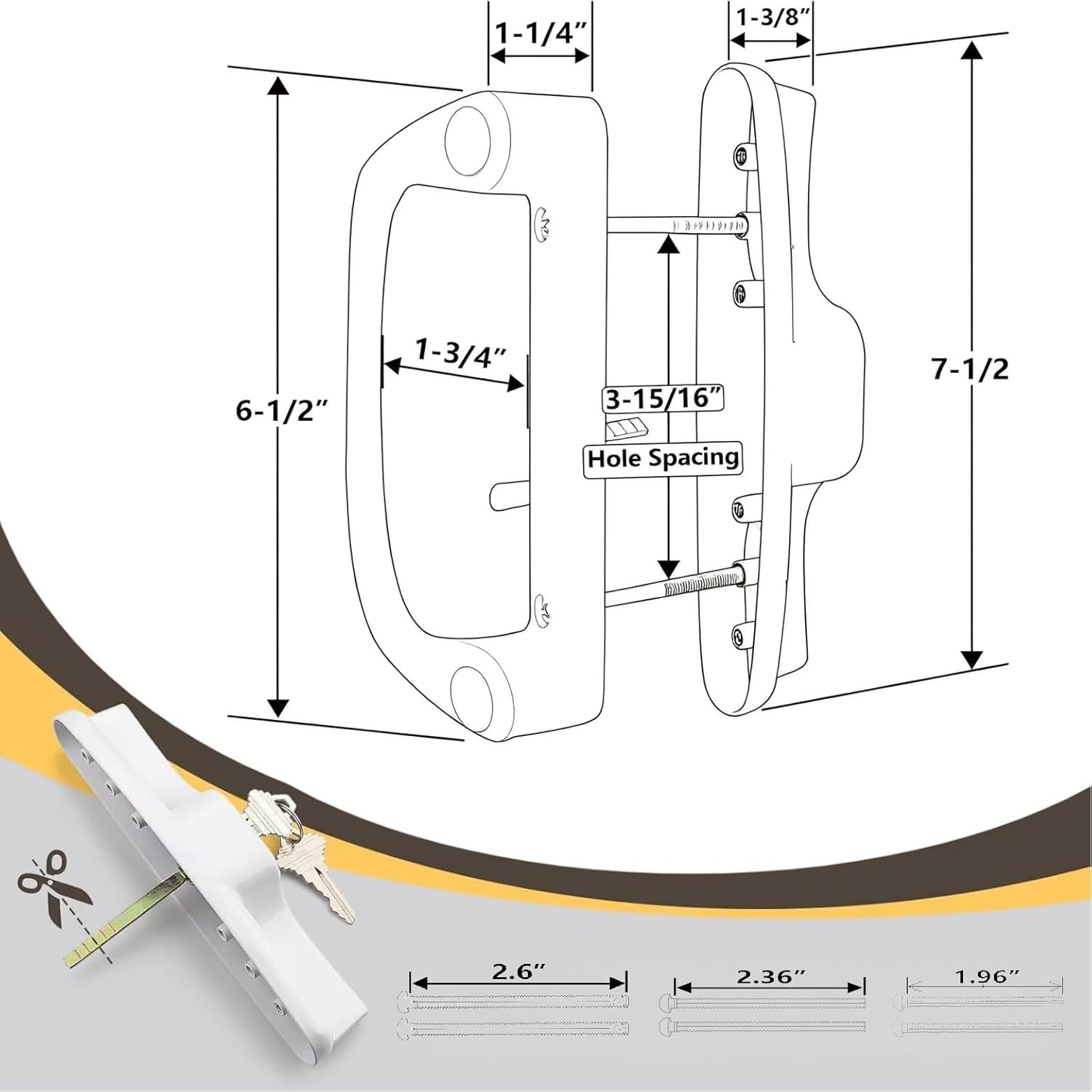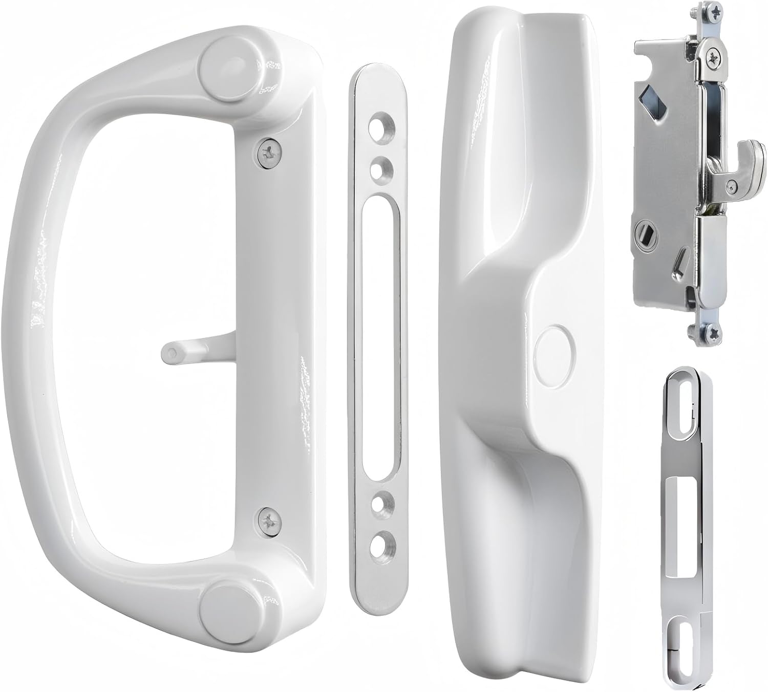 Ruigrit Sliding Door Handle Set - Effortless access meets durable design for your patio or sliding glass doors. Crafted with premium aluminum alloy, these handles resist corrosion while maintaining sleek aesthetics.Keyed Design: Smooth entry with keys - perfect for quick patio accessAdjustable Thumb Latch: Customize positioning (offset/center) to match your door's pre-drilled holesUniversal Compatibility: Fits 1-1/4" to 2" thick doors with 3-15/16" hole spacing (45° keyway mortise lock)Complete Kit Includes: 1 interior handle, 1 keyed exterior pull with 2 keys, 1 thumb latch, 1 mortise lock keyway, 3 screw pairs (2-9/16", 2-3/8", 2"), 1 keeper and installation guide.