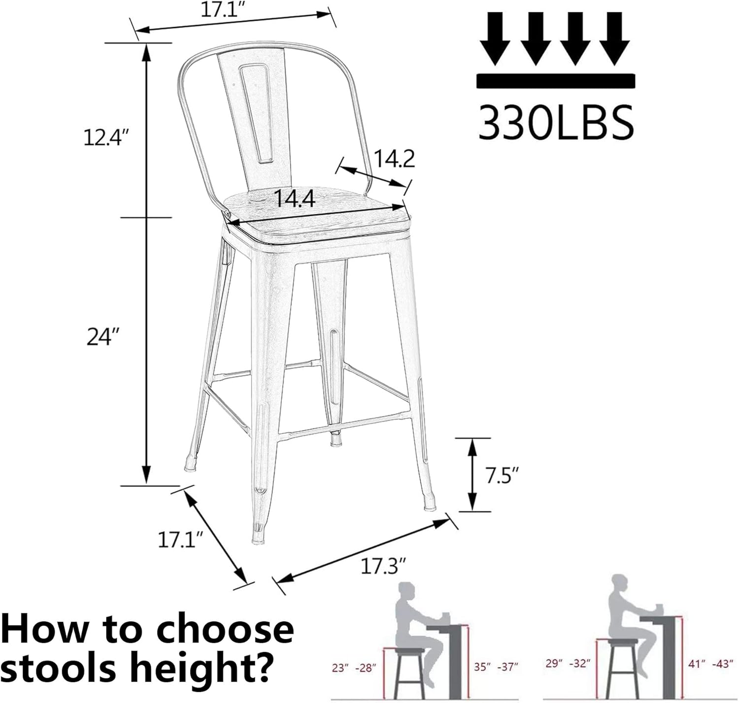 Alunaune Counter Bar Stools Set of 4, 24" 26" 30" seat high choice, four color options, weight capacity 330lbs. Only wooden seat and back need to be installed. Features Lightweight Design For Bar or Counter Use High Quality Steel with Reinforced Legs Arrives Ready To Assemble