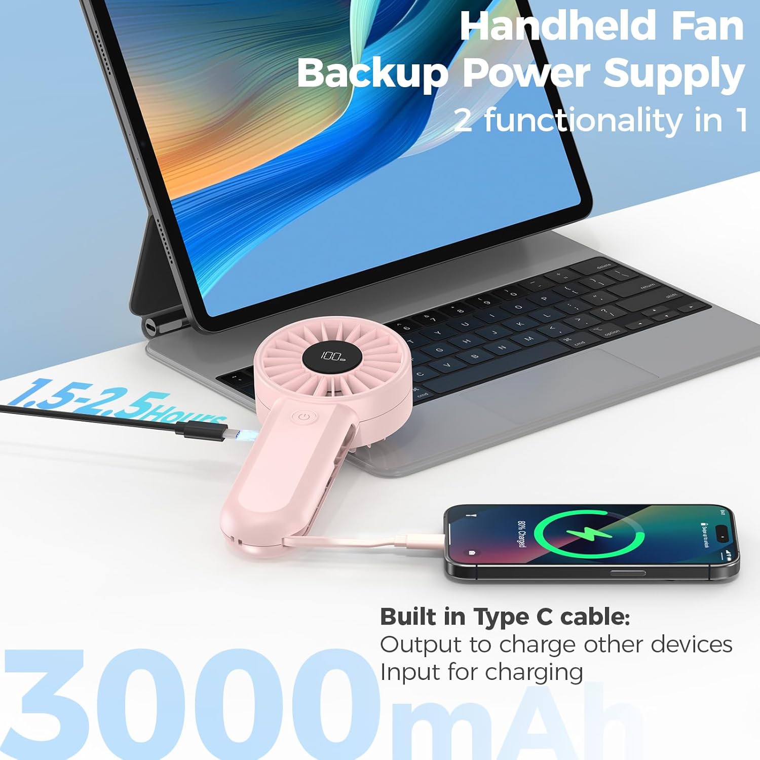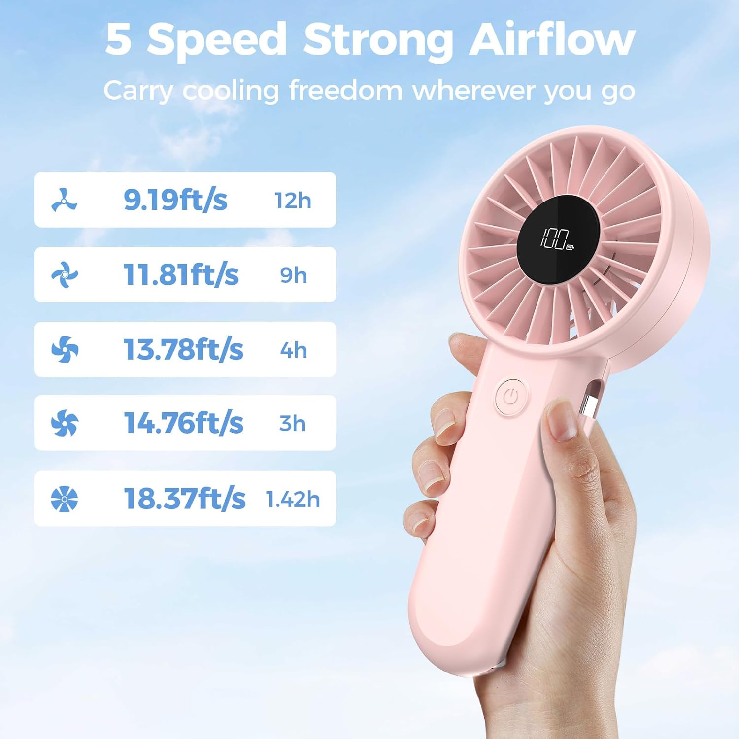 AMACOOL Handheld Fan Rechargeable, Built-in Type-C Cable, 5-Speed Personal Fan with LED Display, Max 12H Runtime, Portable Fans for Travel Outdoor Cruise Makeup, Gifts for Women Stylish Girl (Pink)