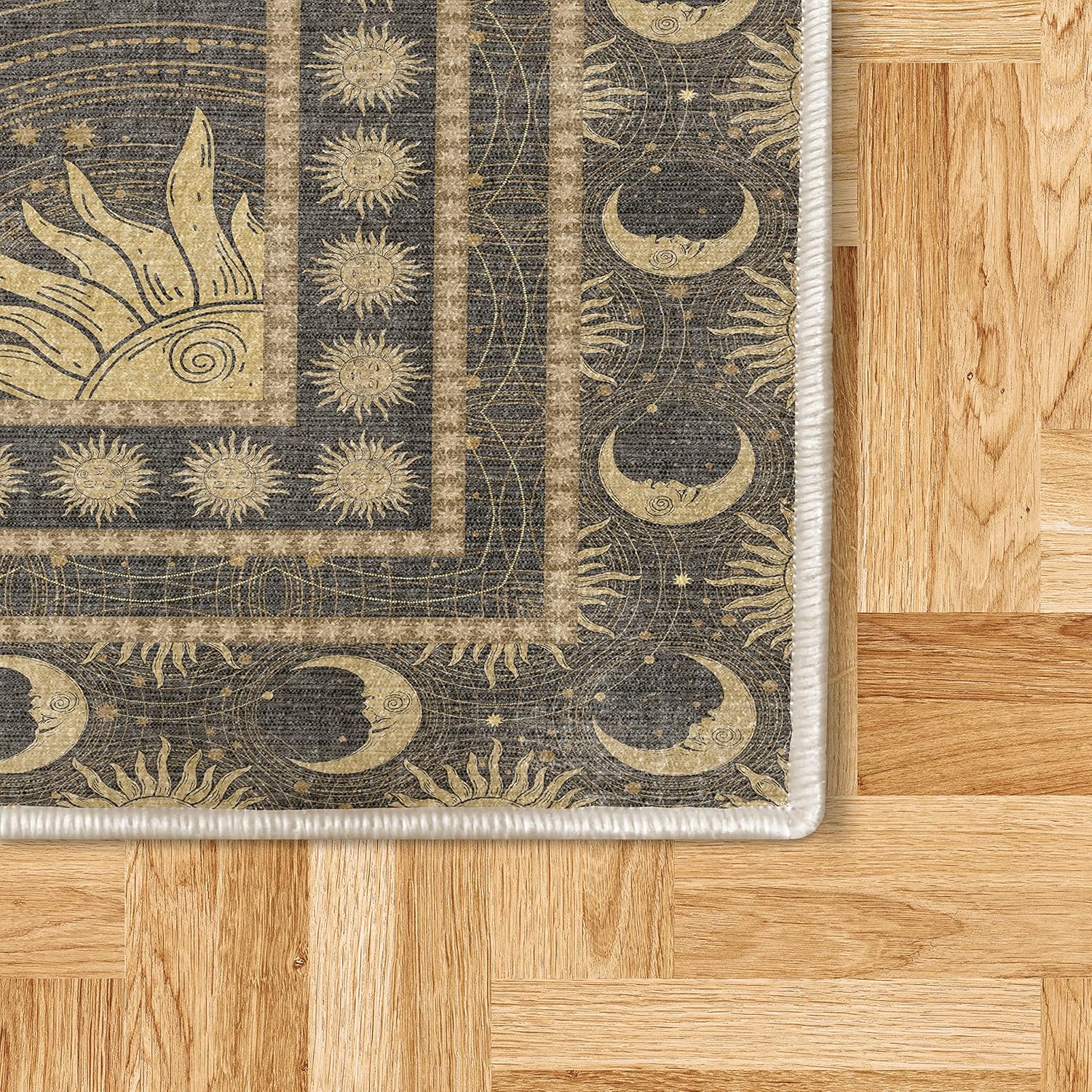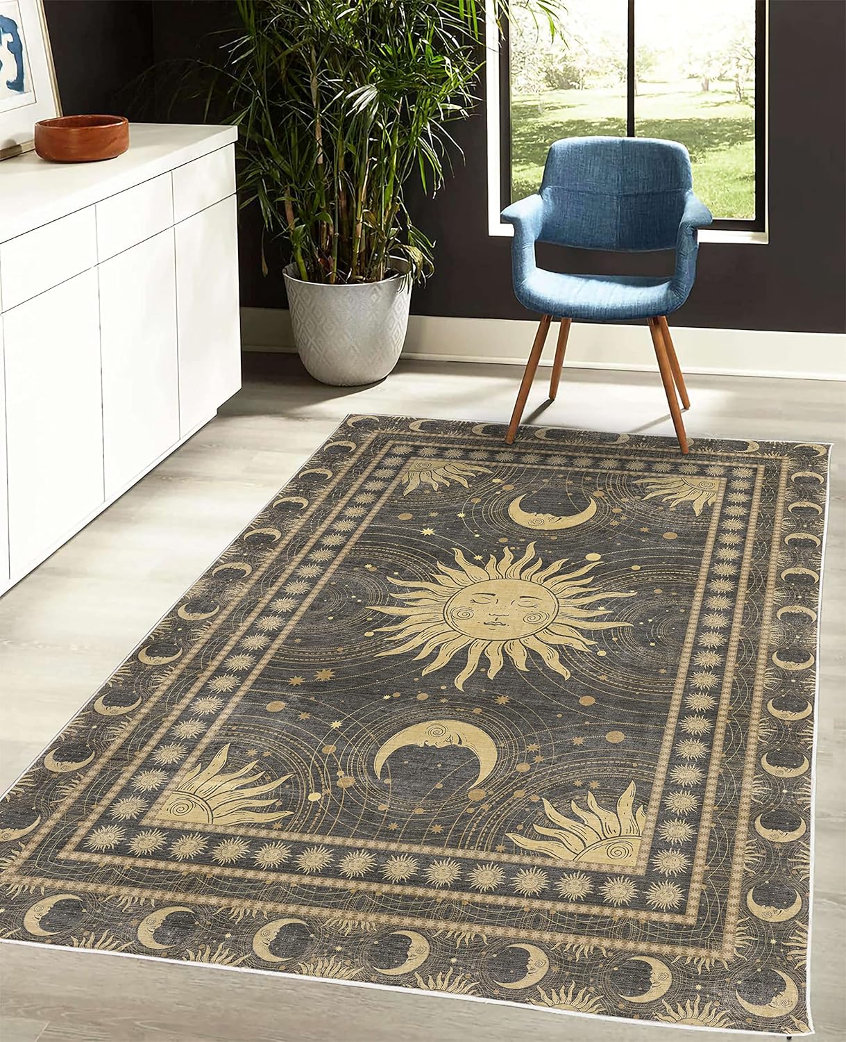 Ambesonne Sun and Moon Decorative Rug, Bohemian Art Design of Crescent Solar Ornament Esoteric Stars, Quality Carpet for Bedroom Dorm and Living Room, 4' X 5' 5", Charcoal Grey Sand Brown
