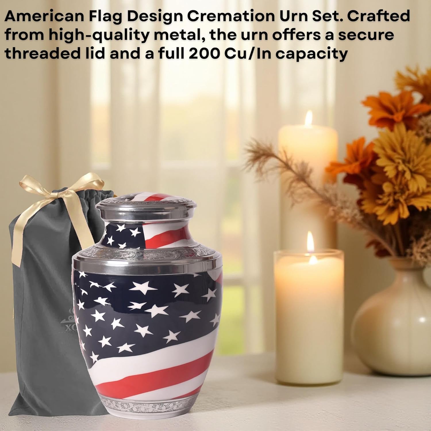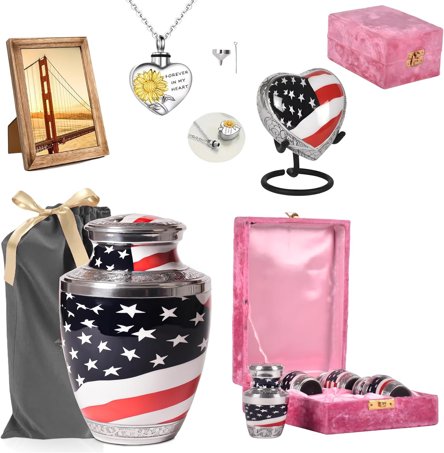 Included Components American Flag Urn, Bag, Funner & Needle, Heart Necklace for Ash, Wooden Photo Frame