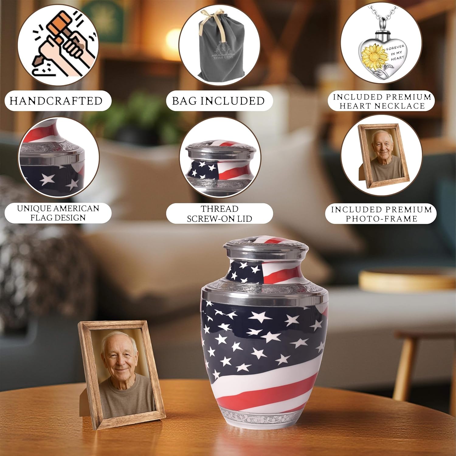 American Flag Cremation Urns for Human Ashes, Large 200 Cu/in Decorative Urn with Photo Frame & Heart Necklace – Patriotic Funeral Urn for Men & Women, Handcrafted Memorial Urn