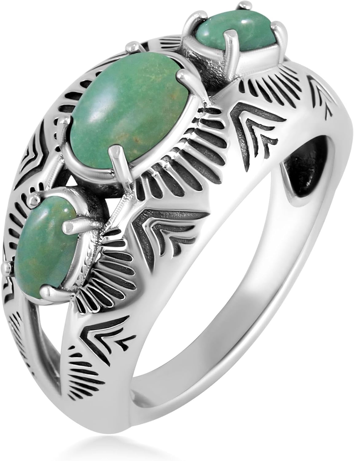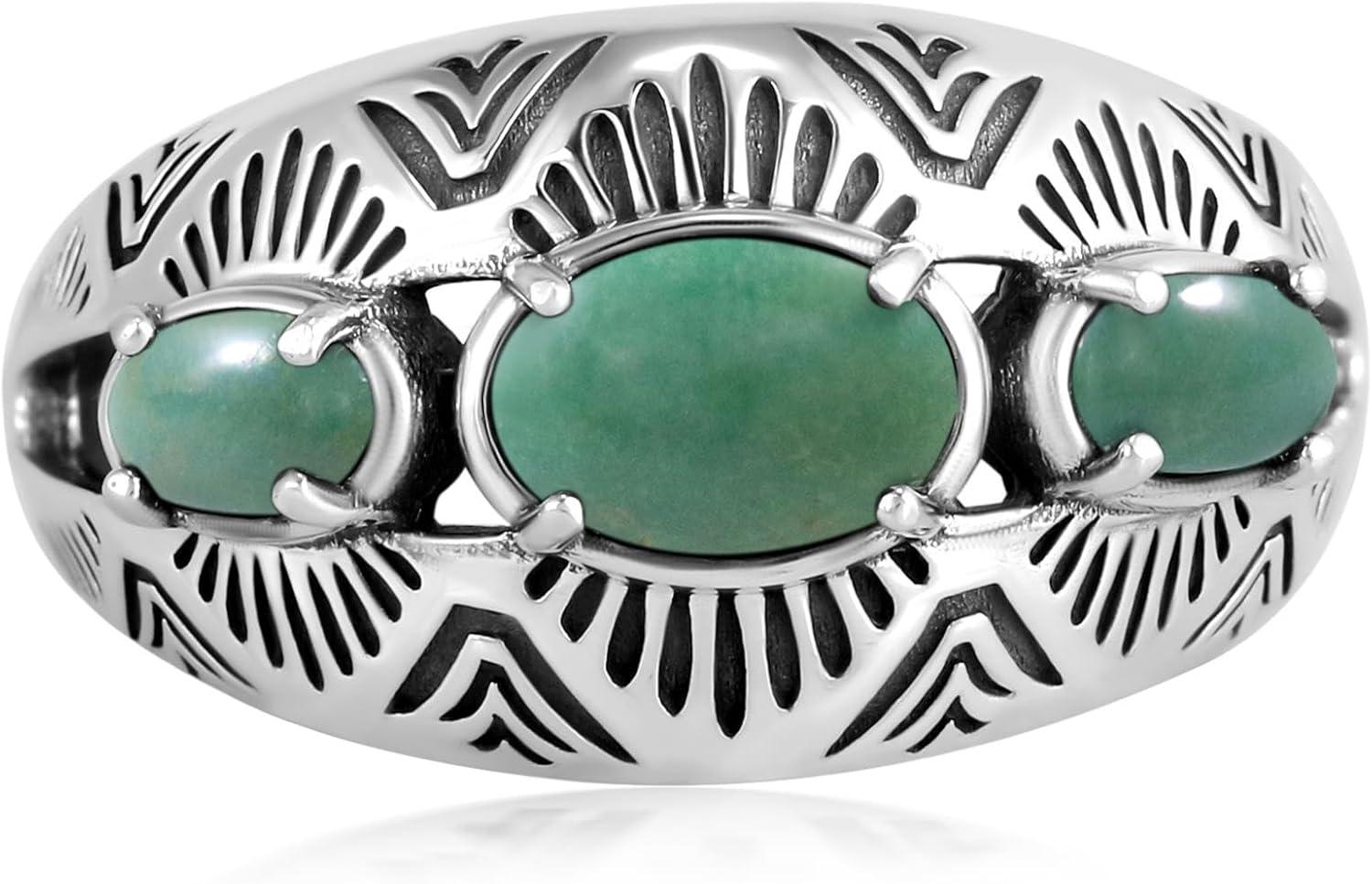 Embolden your personal style with this ornate vintage-inspired Sterling Silver ring detailed with oxidized Southwestern detailing and smooth oval genuine gemstone cabochons. It features a center cabochon in an east-west orientation with a pair of smaller oval-cut gemstones on either side, all prong set in a slightly elevated bezel. These vibrant stones are set on a split shank Sterling Silver band which tapers in the back for comfort.
