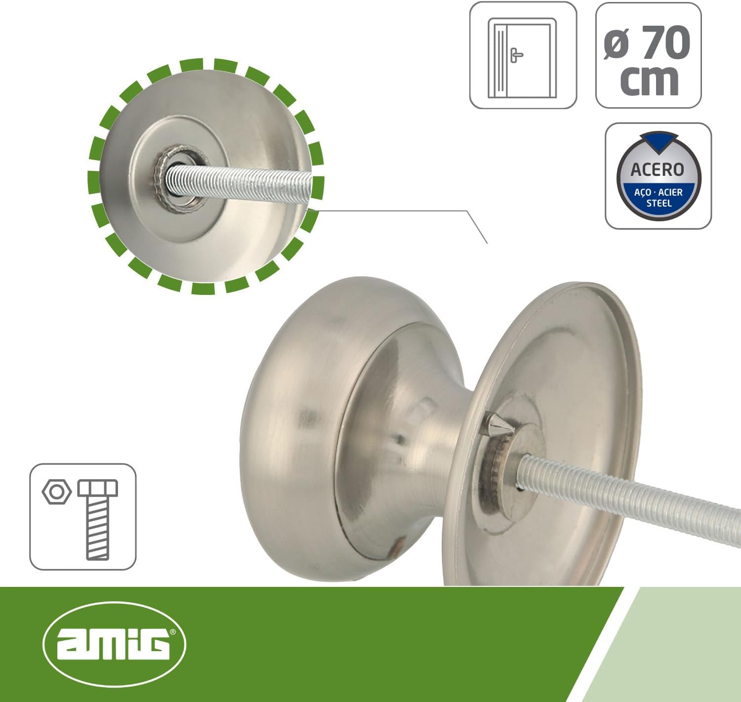 The steel door handle brings elegance and durability to your entryway. Made from high quality durable steel, this knob offers a modern and functional finish, perfect for front doors. Its sturdy construction ensures a long service life, while installation is quick and easy thanks to the threaded stud and nut included. Turn your door into a statement of style with this designer knob. Technical features: - Dimensions: 70 mm - Material: steel - Finish: matt chrome At AMIG, we offer you an infinity of high quality and reliable products developed especially for the maintenance and renovation of your home. You will find locksmith, DIY, hardware, ironwork, gardening, household appliances and home, electricity, professional branch and occupational protection and safety.
