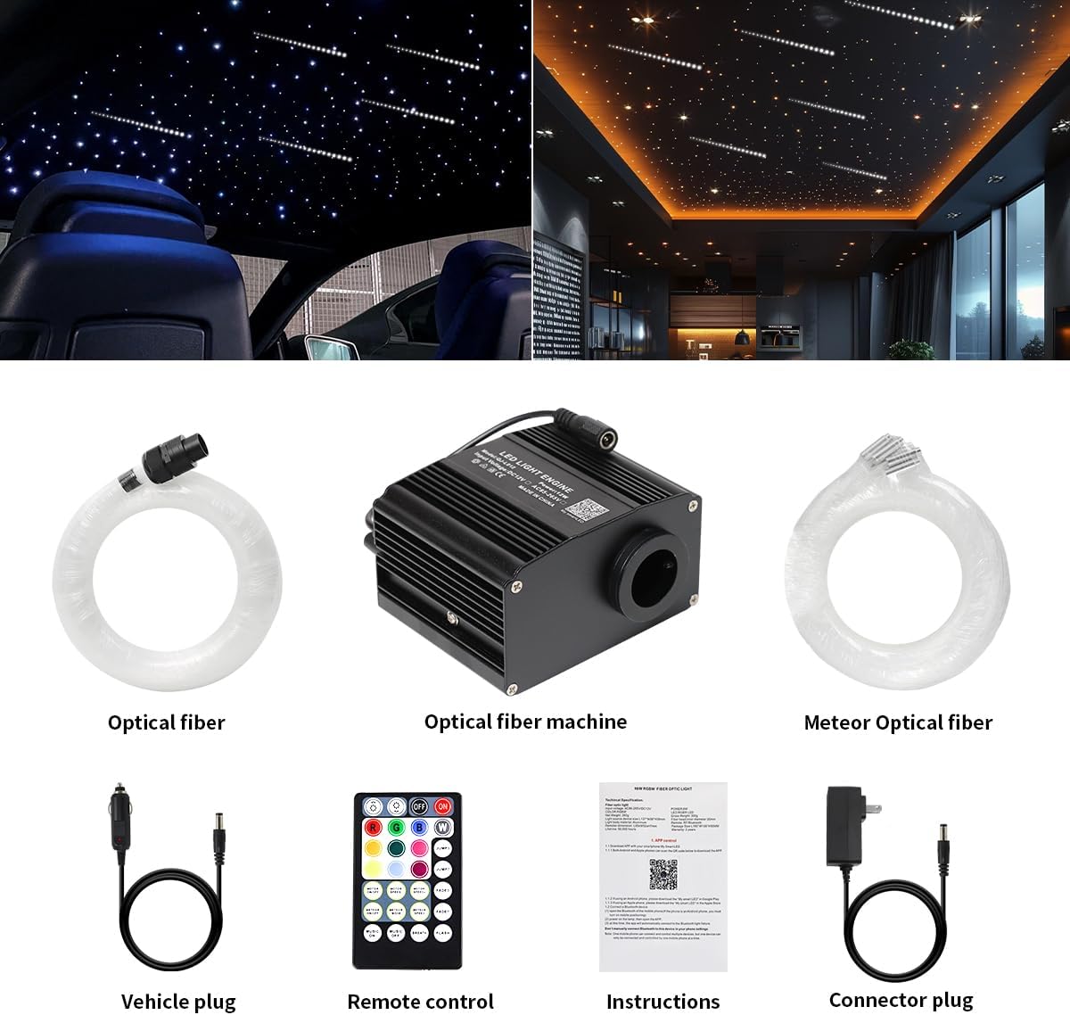Package including : 1x12W twinkle meteor light box 1x300pcs*0.75mm*3meter plastic fiber optic cable 12x (15pcs*0.75mm*3m) meteor fibers+ screws 1x Remote controller 1x User Manual 1x Power adapter 1x 6.5ft car use plug