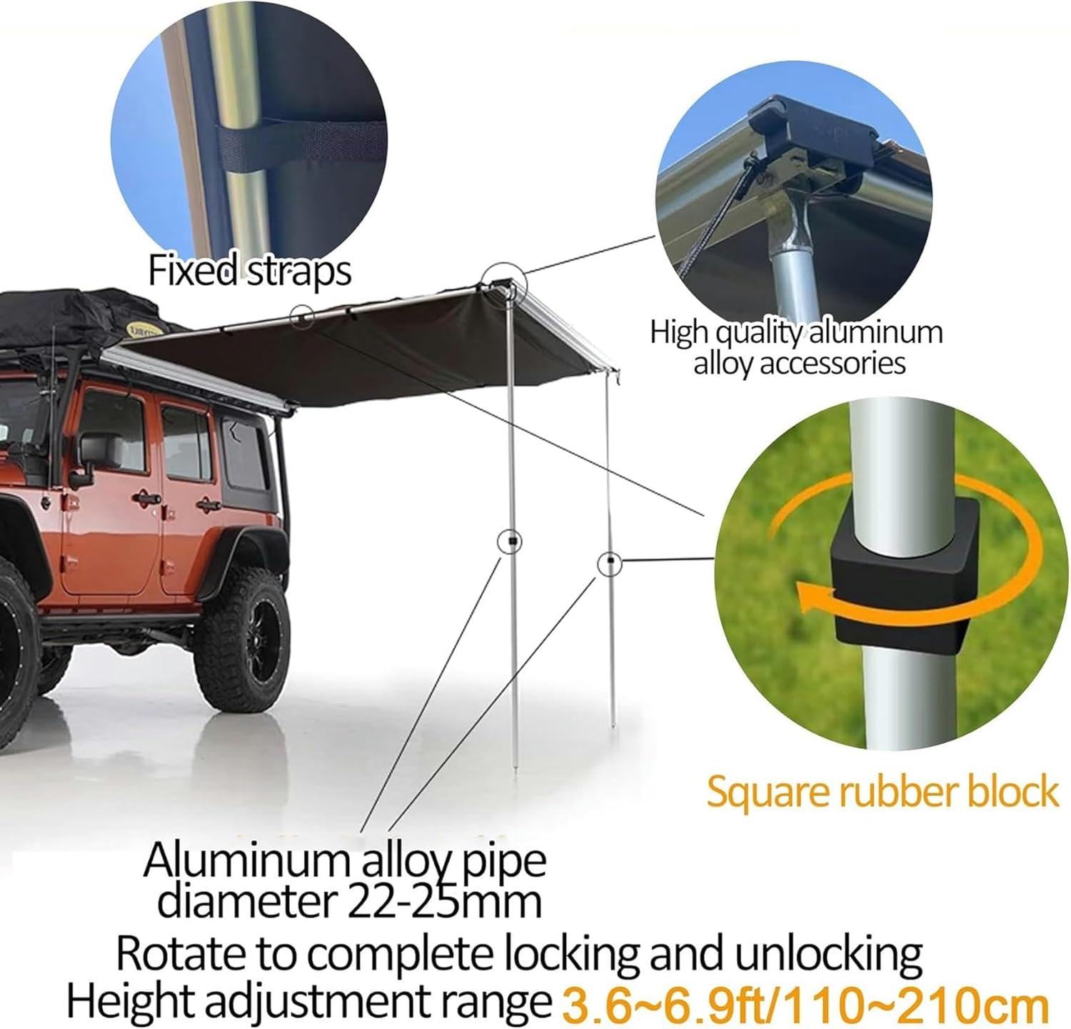 Our for SUV tents are specially designed for outdoor activities.Specifically designed for the hard conditions of the interior, built with a resistant polyester/cotton cotton canvas of 280 g/m² covered with PU, the awning is totally waterproof and offers high sun protection.Easily cover the area for protecting the sun, rain and wind, adequate for camping, picnics, car travel and other outdoor activities.Sun protection and water resistance:Made of 420d Oxford fabric with 5000 mm PU coating.Stable and wind resistantMade of lasting aluminum alloy posts, with pins and tensioning ropes for guaranteeing stability and robustness in different climatic conditions.Configure a simple design:Telescopic posts with rotating block design extend and collapse rapidly and provide rapid and simple installation and disassembly.Easy transport and storage:The whole equipment is packaged in a water resistant transport bag.Space savings for a comfortable transport.Specifications:- Material: Aluminum alloy frame and Oxford 420d fabric- Product characteristics: Complete shaded black glue, sun protection, waterproof, water repellent.- Total dimension deployed: 160x250cm, 200x250cm, 200x300cm- Adjustable height: 110 ~ 210 cm- Suitable for camping, picnics, travel by car and other outdoor activities.Package content1 x lateral awning for car.2 x L -shaped assembly supports2 x I i -shaped assembly supports2 x strings4 x bolt set4 x nut set1 x keys1 x transport bag.