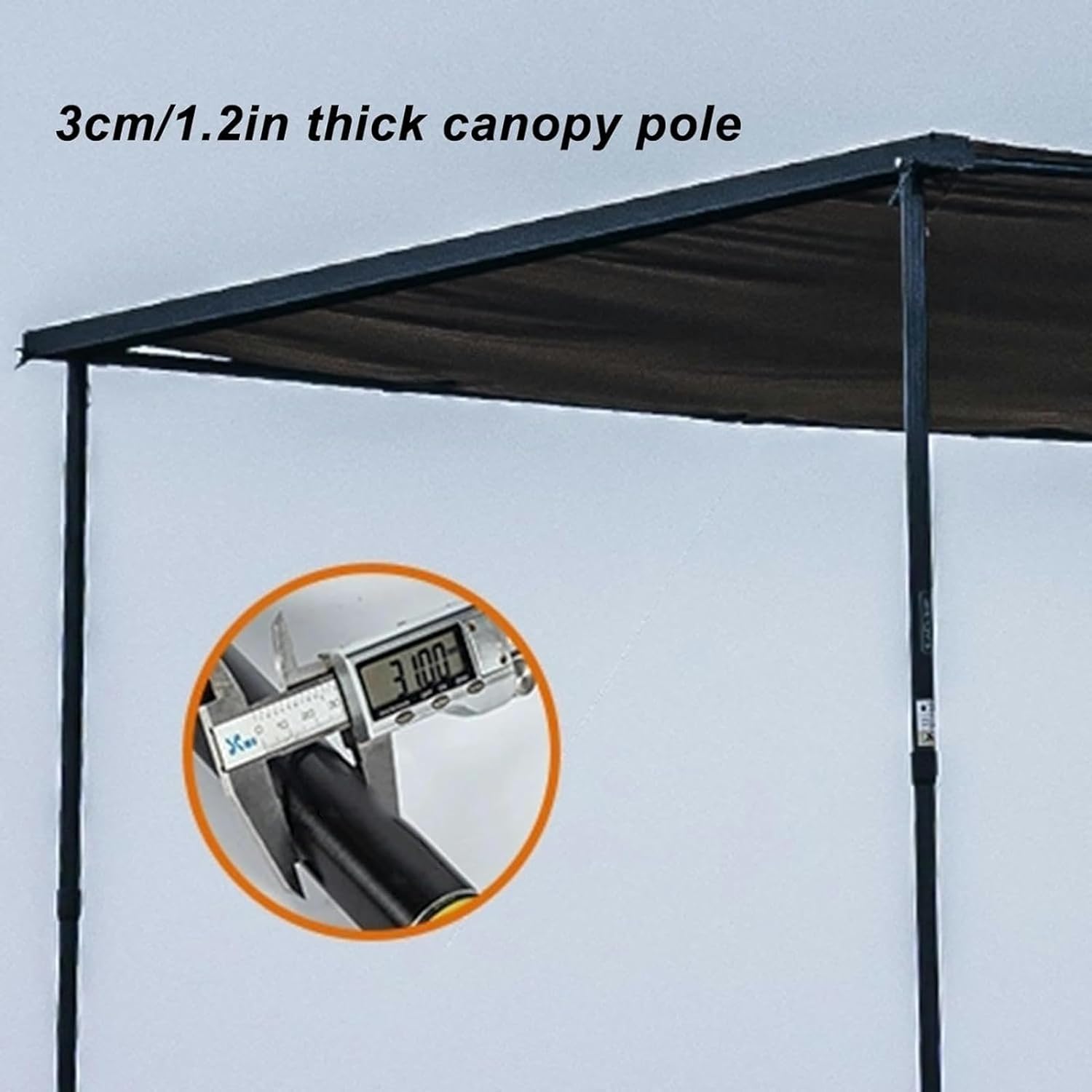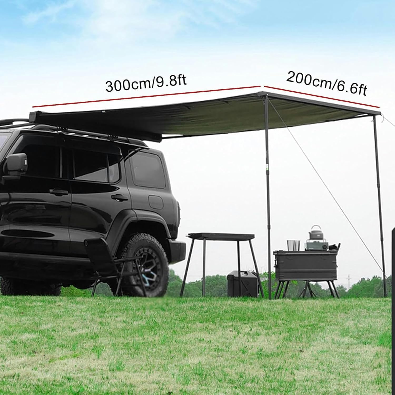 Car awningOur portable awnings are available in a variety of sizes and provide a large shade area to protect themselves from the sun and rain.It could be installed practically in all vehicles with a luggage.With rotating blocking designs in horizontal and vertical support posts, it allows wide and height adjustments, which increases flexibility and provides quick and easy installation and disassembly.Specifications:Material: Aluminum alloy frame and 420d Oxford fabric.Water resistance: 5000 mm PU coatingProduct features: Complete shaded black glue, solar protection, water repellentTotal dimension displayed: 160*250 cm/5.2*8.2 feet, 200*300 cm/6.6*9.8 feetAdjustable height: 93-235 cm/3.1-7.7 feet.Thickness of the aluminum alloy rod: 1.21 mm.Install: installed in the vehicle roof rail to provide a large shadow area.Suitable for camping, doing picnics, traveling by car and other outdoor activities.Package content1 car side awning.2 x L -shaped assembly supports2 x I i -shaped assembly supports2 strings2 x ground nails4 x bolt set4 x nut set2 keys