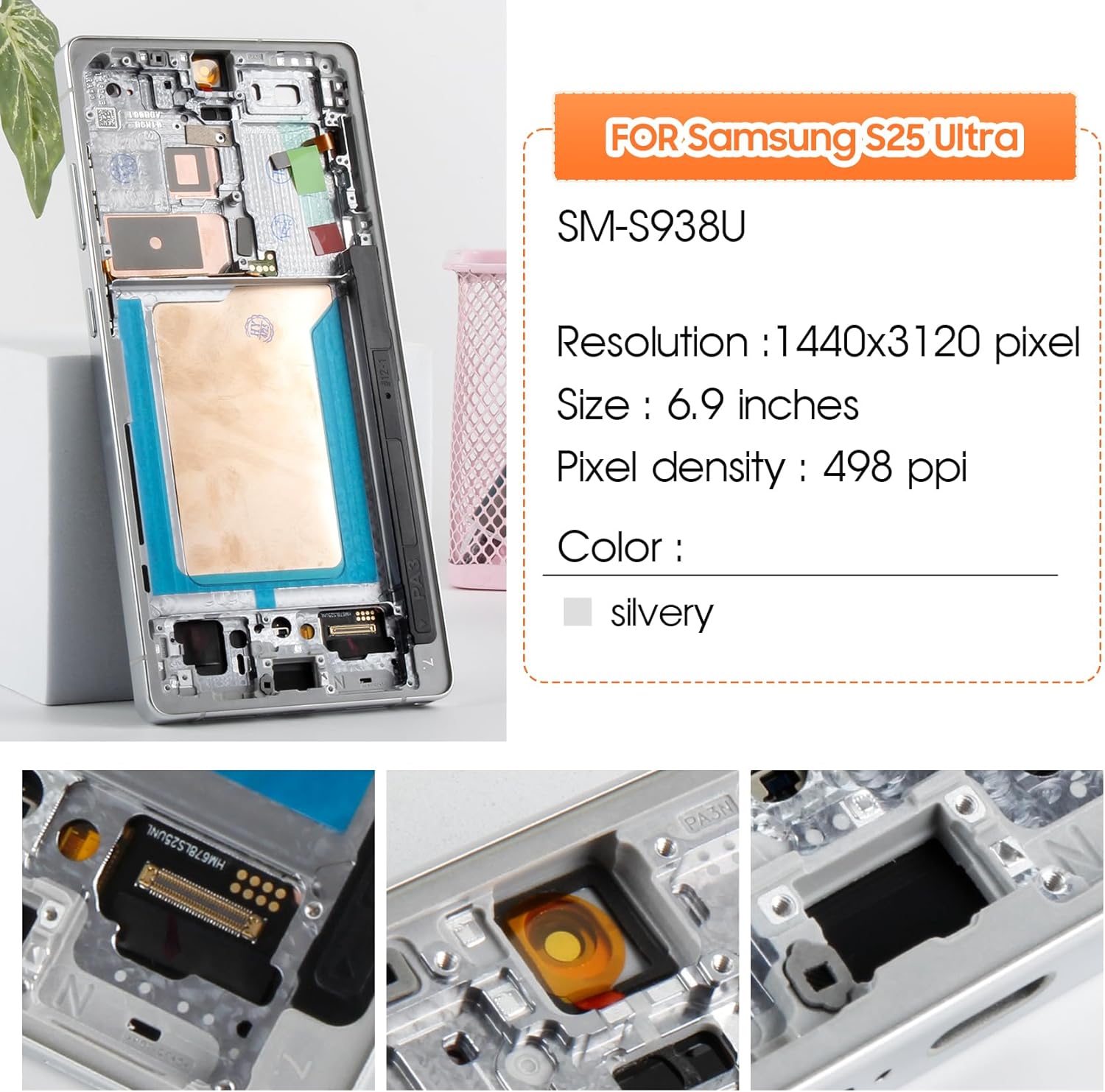 -Compatible With: AMOLED For Samsung Galaxy S25 Ultra 5G Screen Replacement(Titanium Black With Frame)(With Fingerprint Function)-Model Number: SM-S938B, SM-S938B/DS, SM-S938U, SM-S938U1, SM-S938W, SM-S938N, SM-S9380, SM-S938E, SM-S938E/DS-Size:6.9 inches-Resolution:1440 x 3120 pixels【Please Note】▶ Correct installation requires special skills and techniques, you can go to the YouTube site to view the video to learn the installation method before trying▶ It is highly recommended to find a professional to perform the replacement. We may not be responsible for any damage caused during the replacement process▶ Unplug the battery connector and remove the battery before installation to avoid short circuit.▶ Before installing the LCD, remove all the old glue in case it affects the new glue paste.▶ If your case is in an unnatural state such as bent, please replace the case before replacing the LCD. Otherwise, the screen glass is likely to breakBefore confirming your purchase, please verify the model number of your own device, and the correct shipping address.If you find any problems after receiving screen, after learning the specific situation, we will immediately solve the problem for you and provide suitable and effective solutions.
