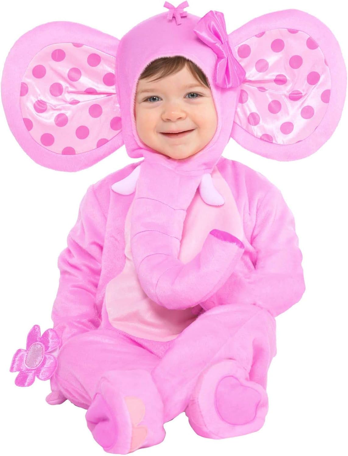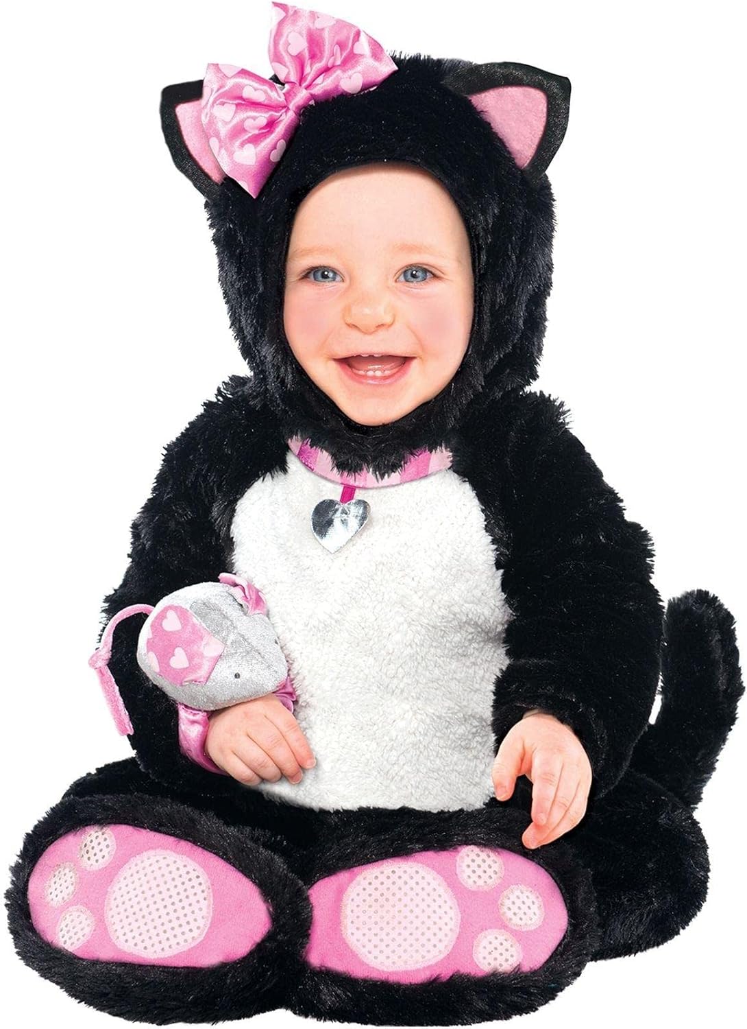 This little Kitty is perfectly precious! This Itty Bitty Kitty costume features a plush black and white jumpsuit with attached collar and tail, and pink soles on the booties. The separate black fur hood has felt cat ears with a silken pink bow dotted with little hearts on one ear. Keep your little kitten entertained with the gray and pink mouse rattle that slips on easily over her wrist — so sweet!
