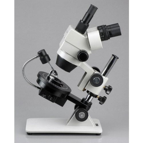 This is an advanced 3.5X-90X trinocular jewelry/gem stereo zoom microscope with rotatable darkfield stage, cordless LED illumination and a 1.3MP color USB2.0 digital image system that is specially designed for darkfield microscopy. The microscope comes with a trinocular zoom head, adjustable inclined-pillar stand, rotatable round stage with darkfield condenser and iris, 3D jewelry/gem clamp, and LED illumination system with top (reflected) and bottom (transmitted) lights.The trinocular port enables to add photographic or video capability. The adjustable inclined-pillar stand ensures a comfortable observation. The rotatable darkfield condenser and the 3D gem clamp make it possible to measure gem angles. The illumination system adopts contemporary high-power LED lamps, providing rich spectrum, high-temperature color (though the LED light is cool), and close-to-daylight illumination. The flexible top gooseneck lamp shines light down onto objects, used to observe the surface details and fine structures of jewels or gemstones. The transmitted light through the darkfield condenser is designed for the examination of the inside quality of diamonds. With the cordless LED system and the wide-voltage (90-240V) adapter/charger included for wall-power convenience, this microscope is great for both on-site and in-house applications. It offers crystal clear images, extremely wide zoom magnification range (26:1), and very large working distance (8"). The digital camera captures still images and video, and allows you to view a live stream on your PC. With software available for Windows, Mac, and Linux, it's a multi-platform imaging solution. The included Windows software offers image-development and measurement tools, as well as advanced compositing features such as image-stitching and extended-depth-of-focus. Independent preview and capture resolutions allow you to view high-speed video while capturing high-definition images. For Mac and Linux, there is a lite ver